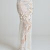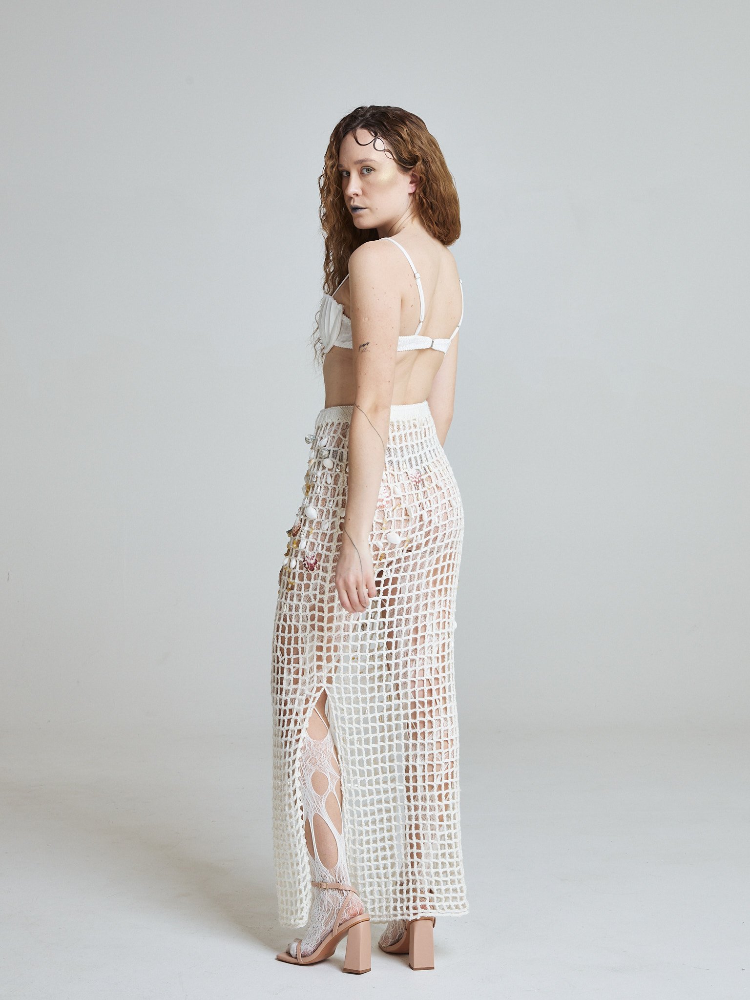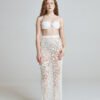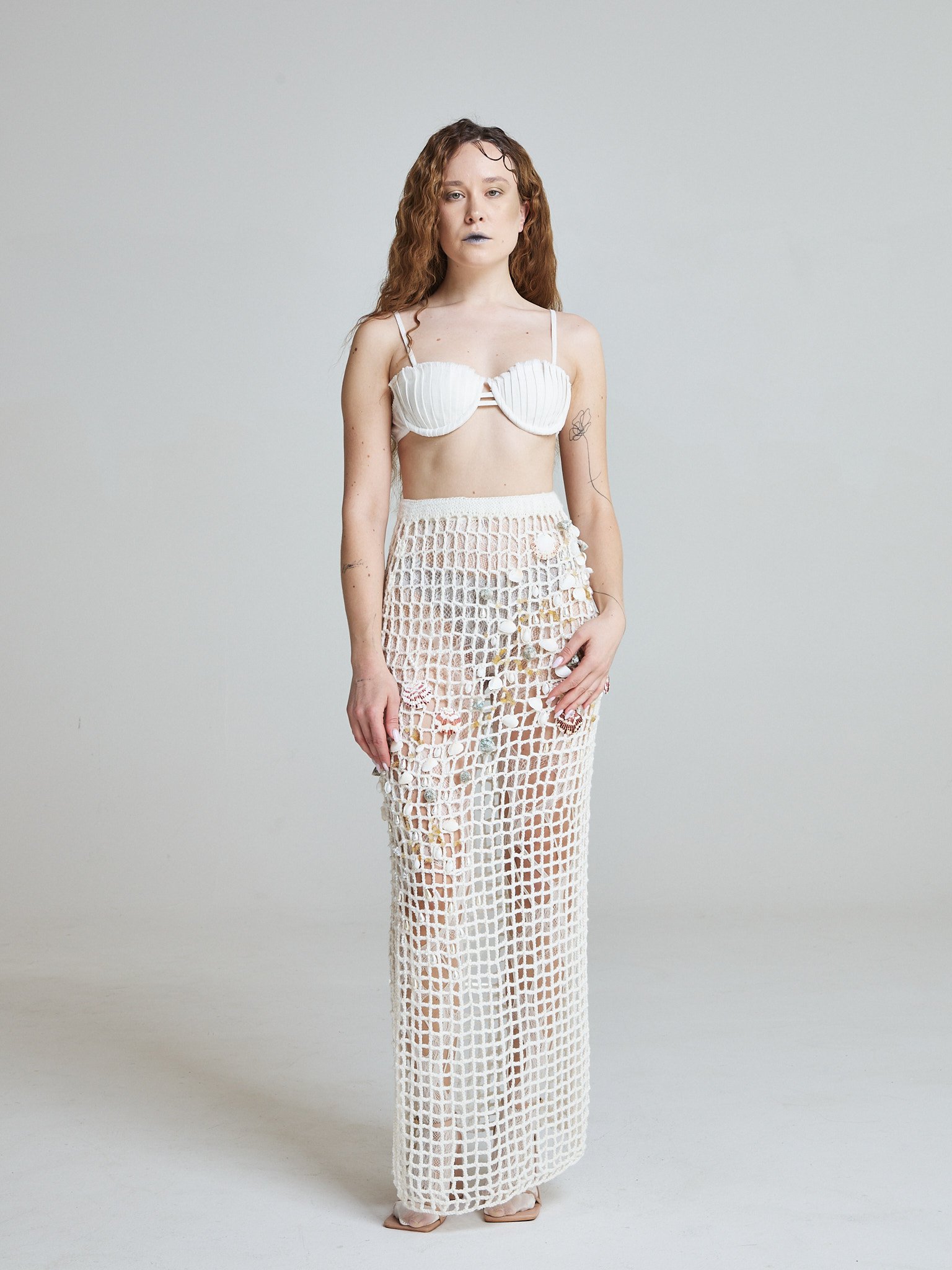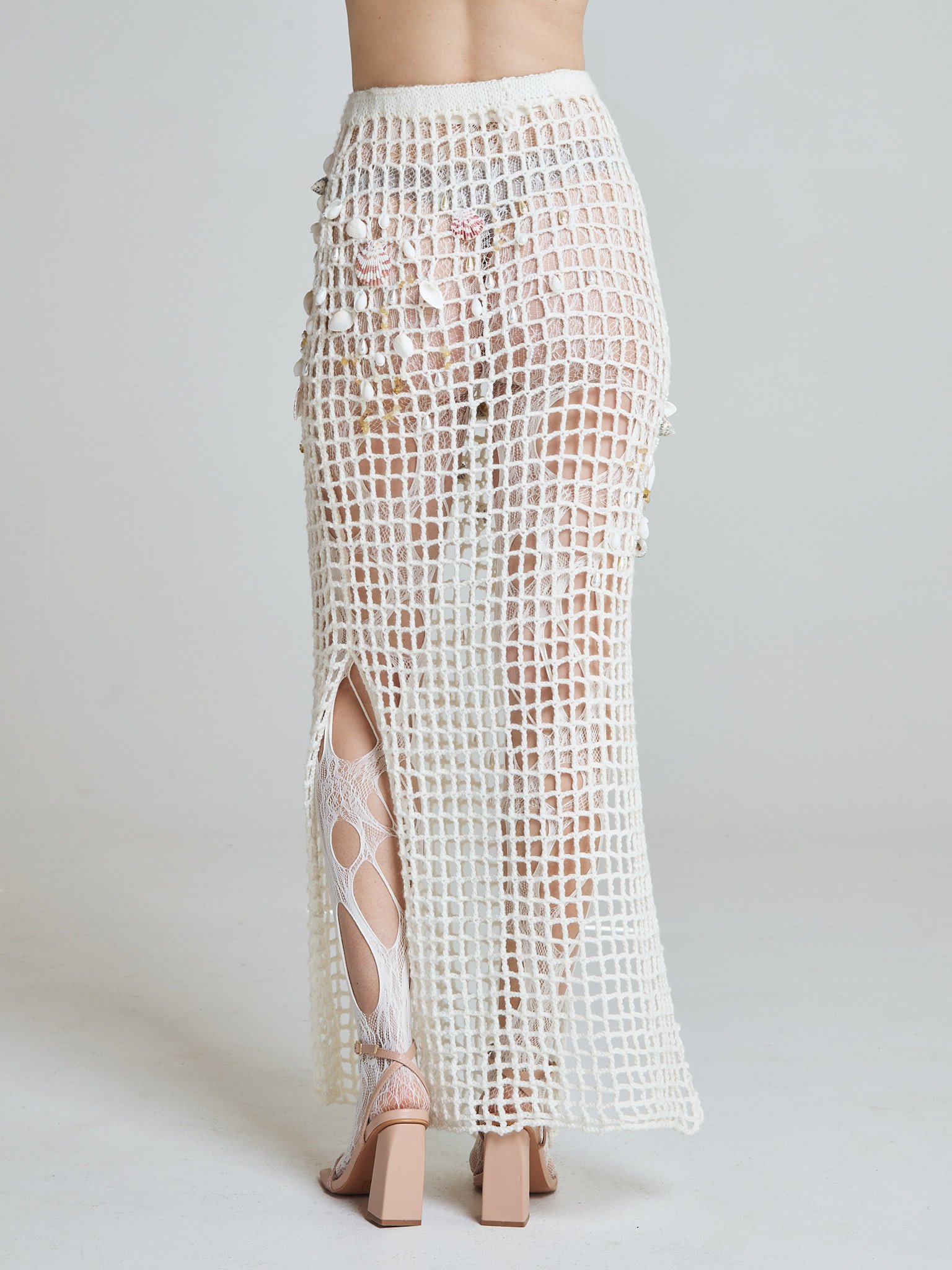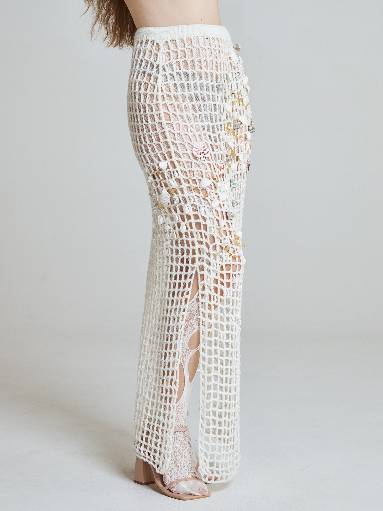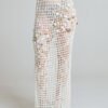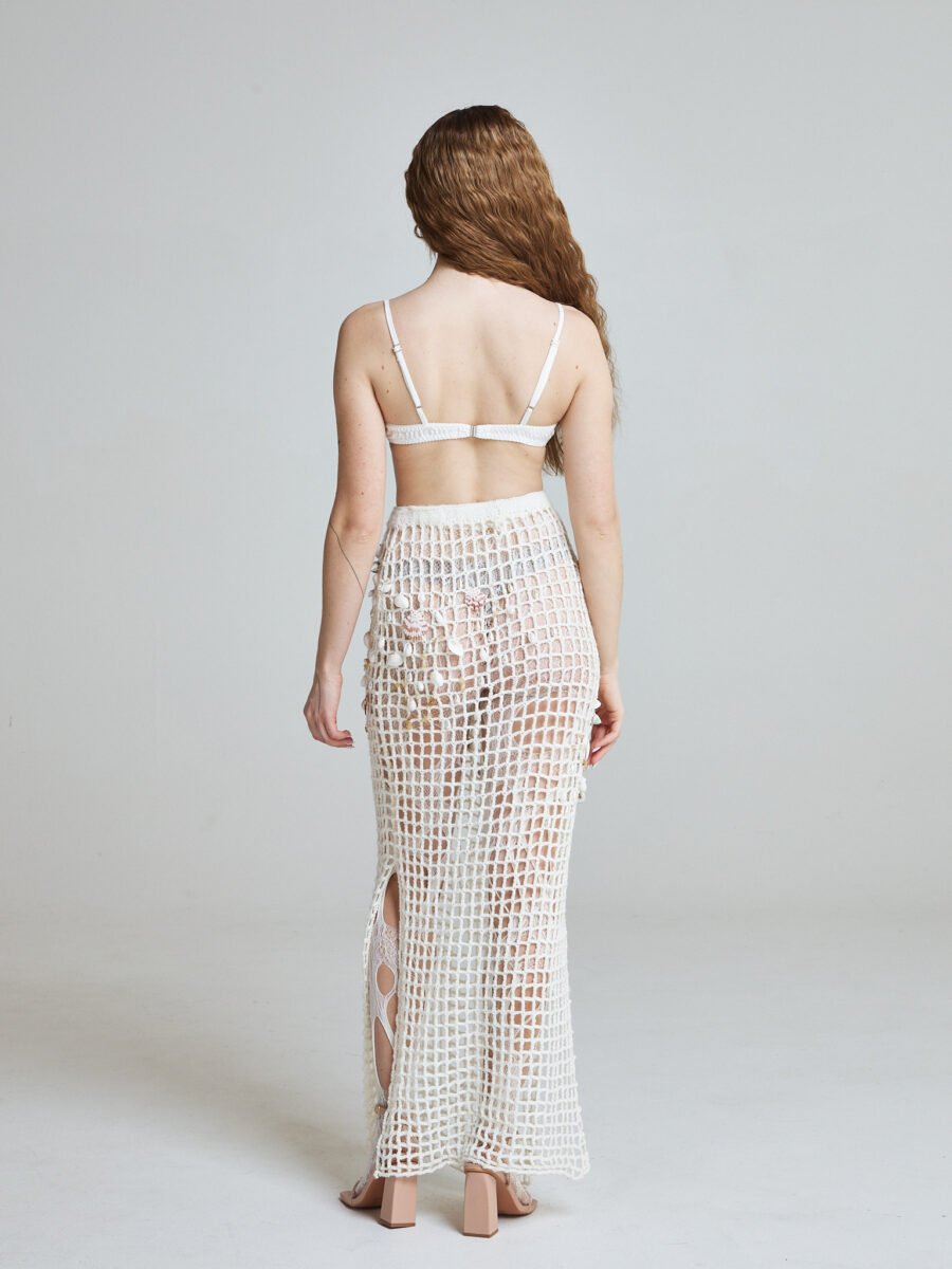 The Sea Relic Net Skirt is hand crocheted from a wool and cotton blend, forming an open structured grid inspired by fishermen’s nets. Designed in a long pencil silhouette, it elongates the body while maintaining fluidity and movement.