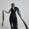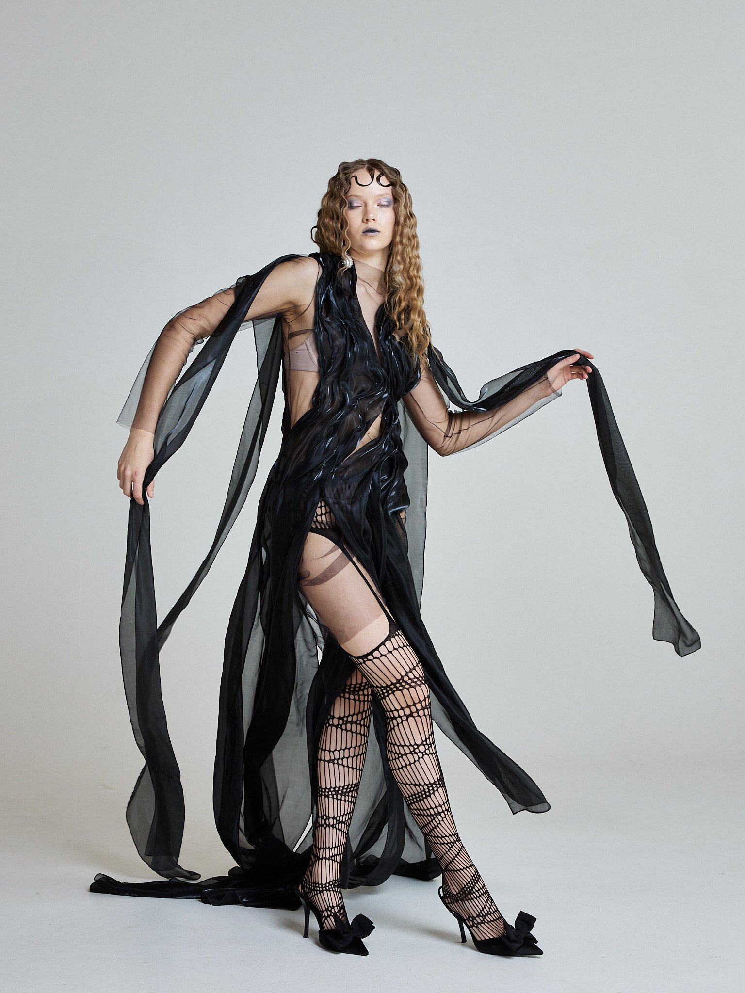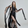 Long, extended draped panels flow from the sleeves and sides, creating continuous motion with every step. The silhouette is both sensual and untamed – structured drape meeting organic movement.