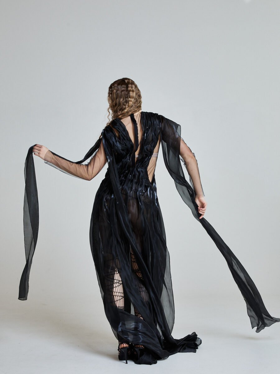 The Abyss Veil Gown is crafted from sheer black organza, sculpted through a signature draping technique developed from Laura’s original textile painting process. The surface carries subtle depth and tonal variation – like light catching moving seaweed in dark water.