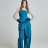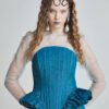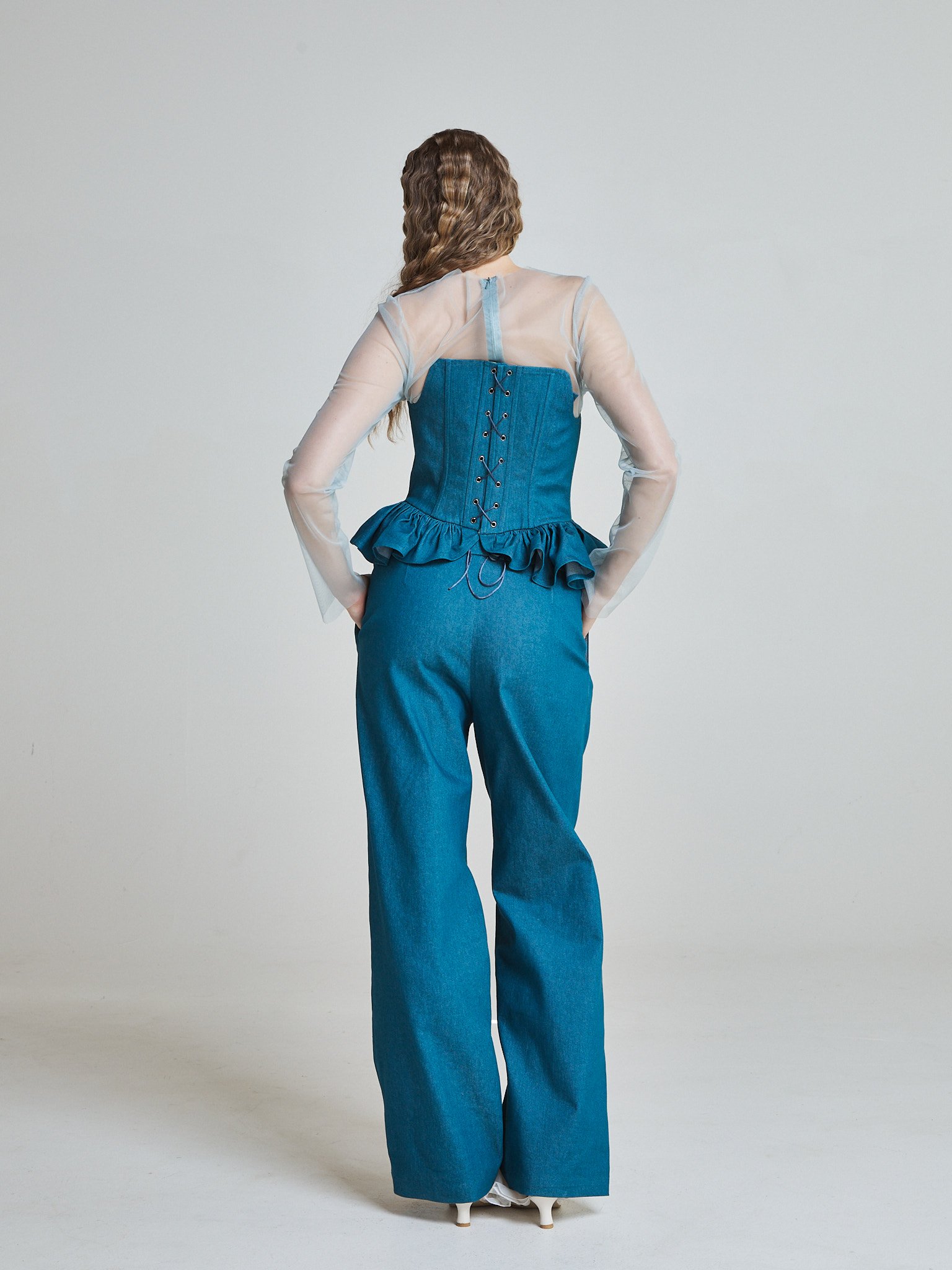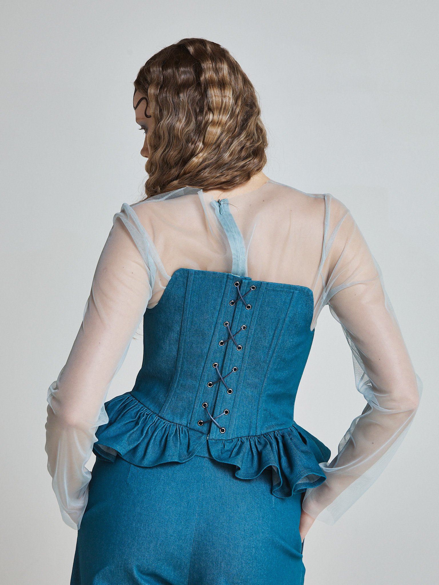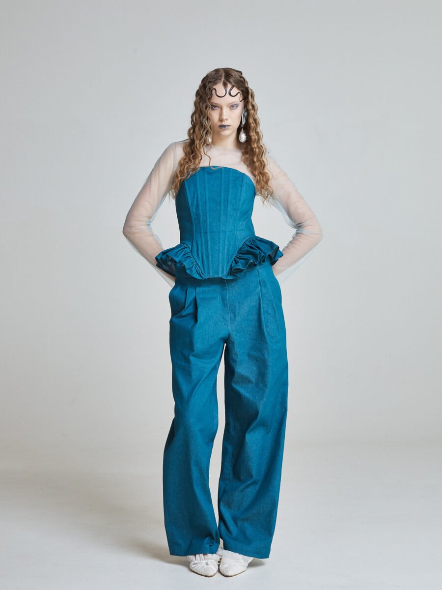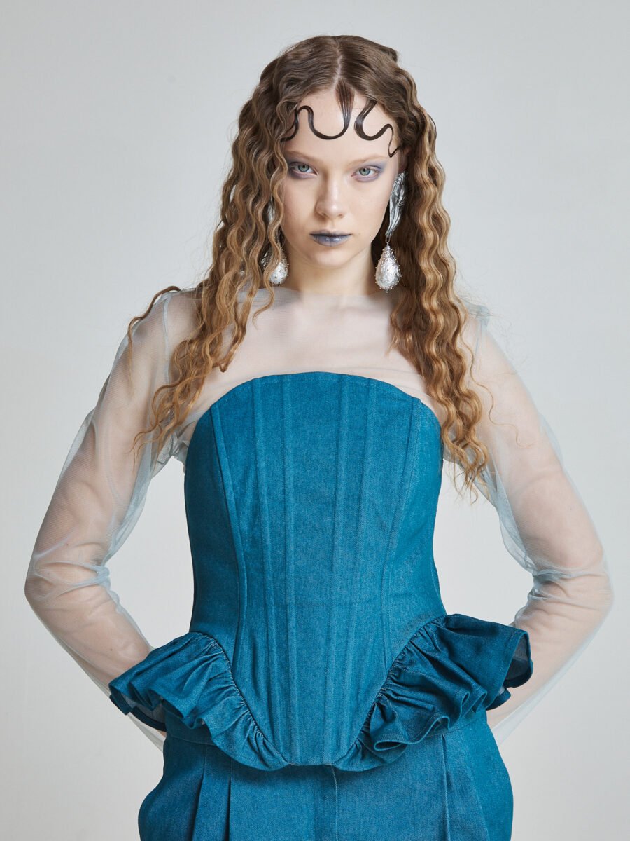 The Abyssal Current Corset is crafted from 100% textured denim cotton in a deep seaweed blue tone. The silhouette is sharply contoured through the waist, with architectural seaming that elongates the torso.