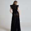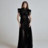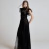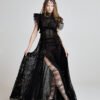 Beneath the net layer, two soft black tulle underdresses create dimension and shadow, allowing light to pass through the structure while maintaining fluid coverage.