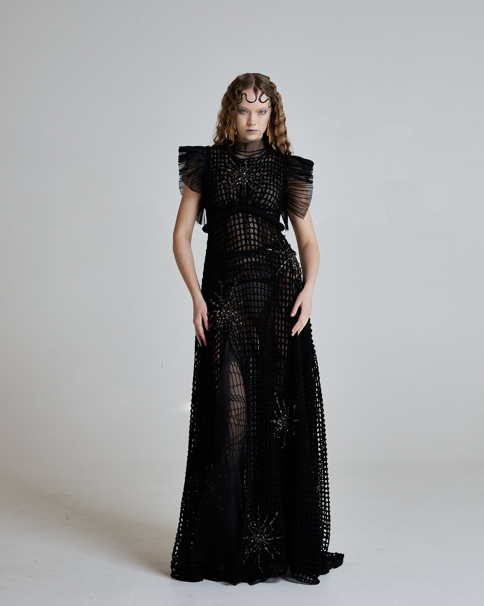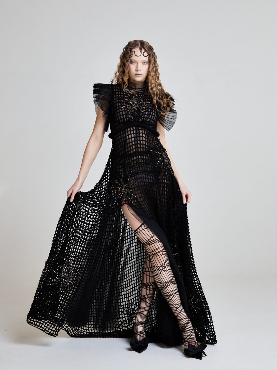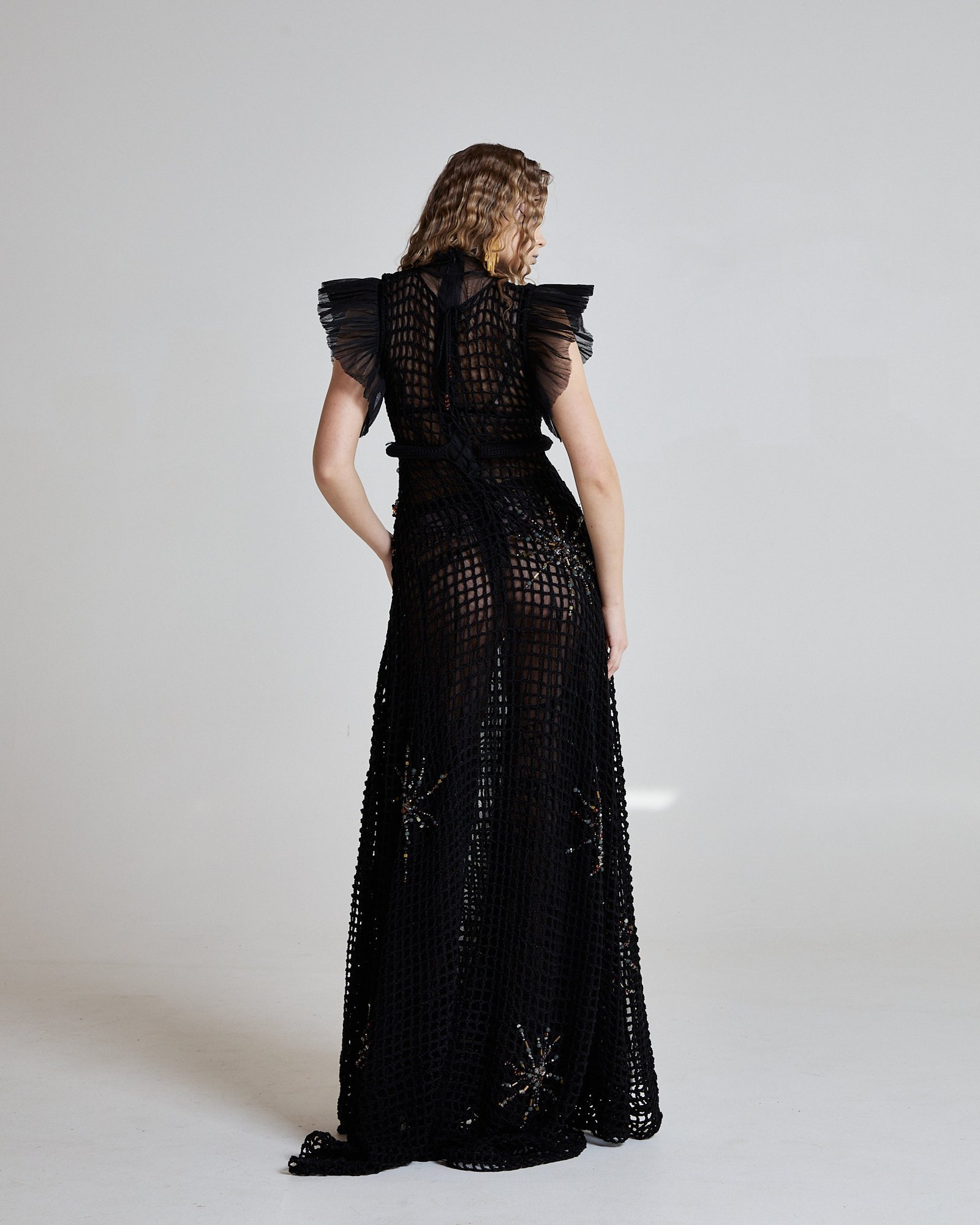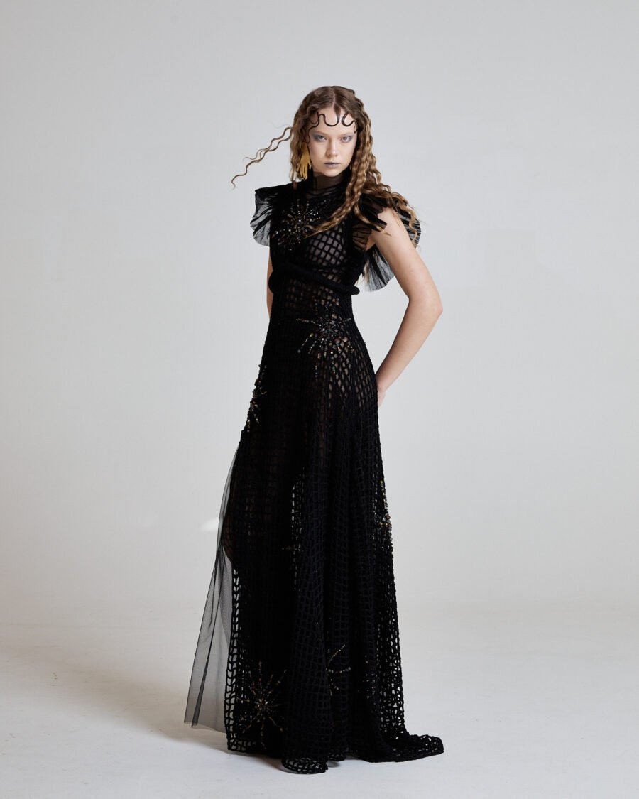 The Abyssal Starlace Gown is hand crocheted from black cotton yarn, forming an open net structure that moves like sea currents around the body. The surface is embroidered with semi-precious stones – amber, cat eye, crystals, onyx, moissanite, volcanic stones – each placed like fragments of starlight scattered across midnight water.