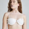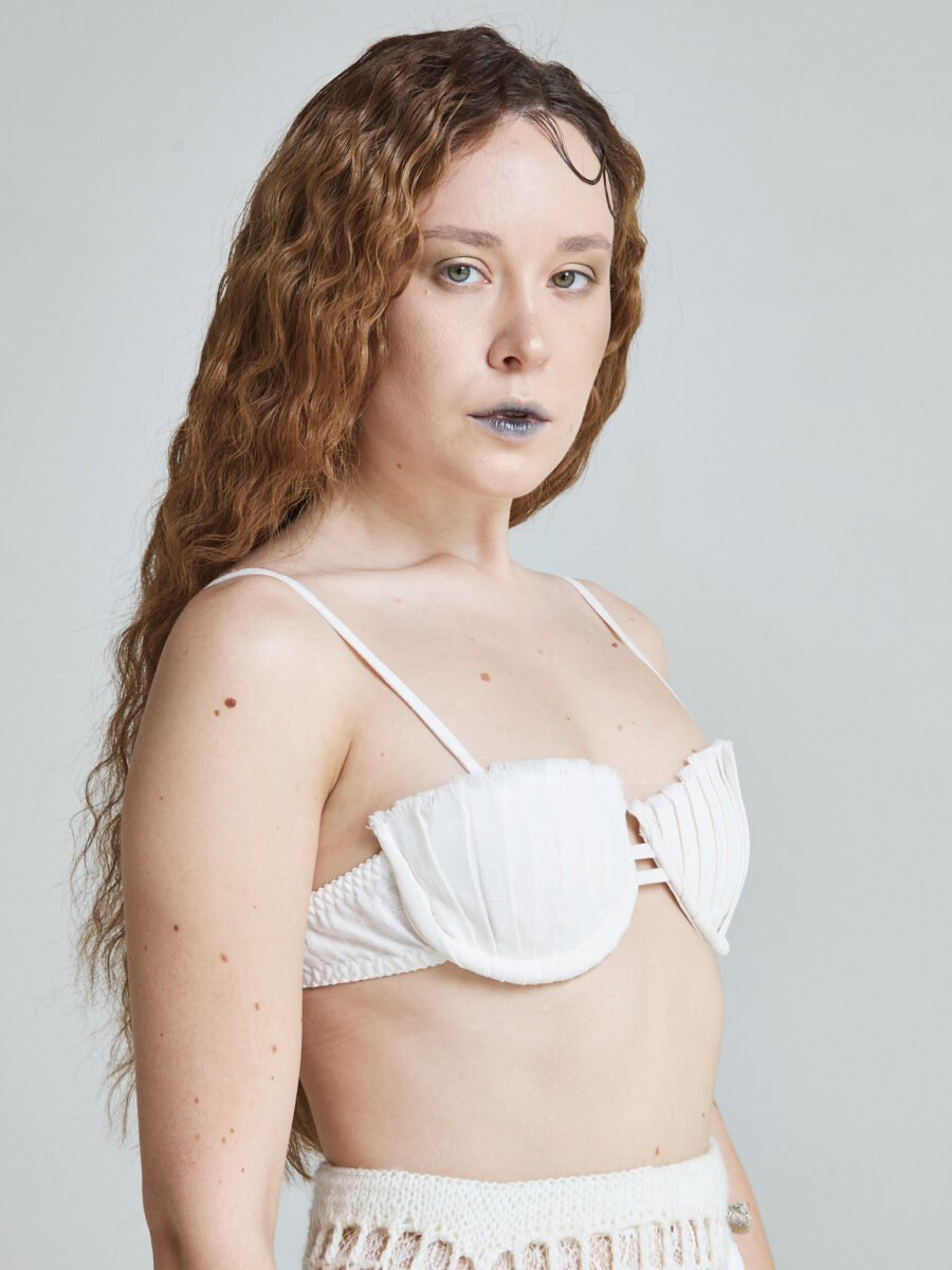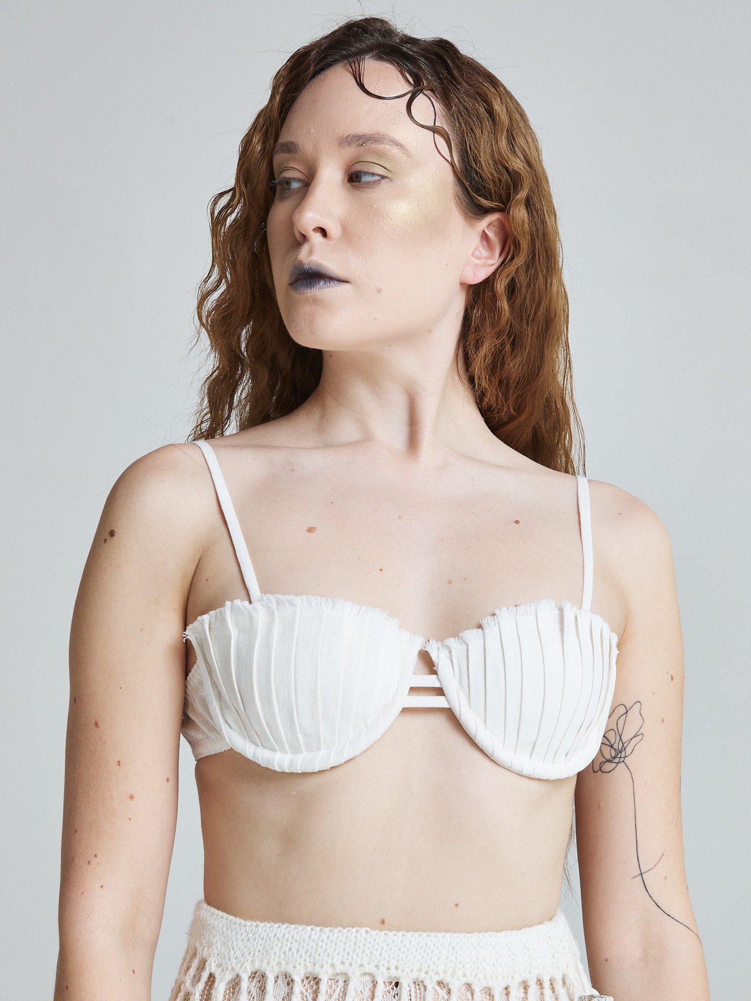 The Shoreline Shell Bra is hand pleated from 100% linen, shaped to echo the natural curves of seashells collected along the shore. Each cup is individually structured through careful pleating, creating soft ridges that resemble the texture of found shells.