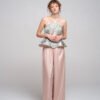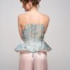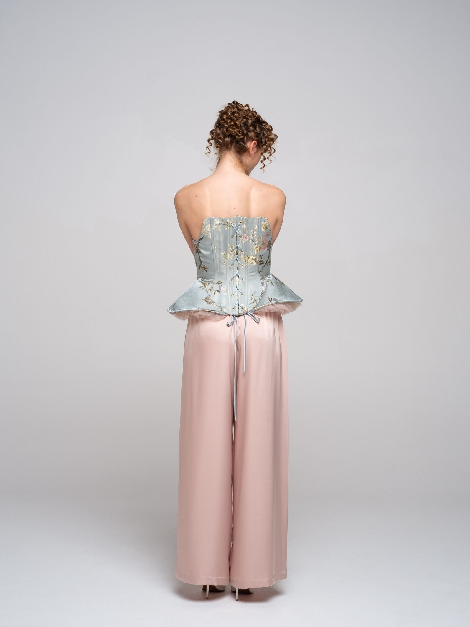The silhouette extends into a sculptural peplum that flares from the waist, revealing soft dust-pink ruffles beneath – creating tension between structure and delicacy.