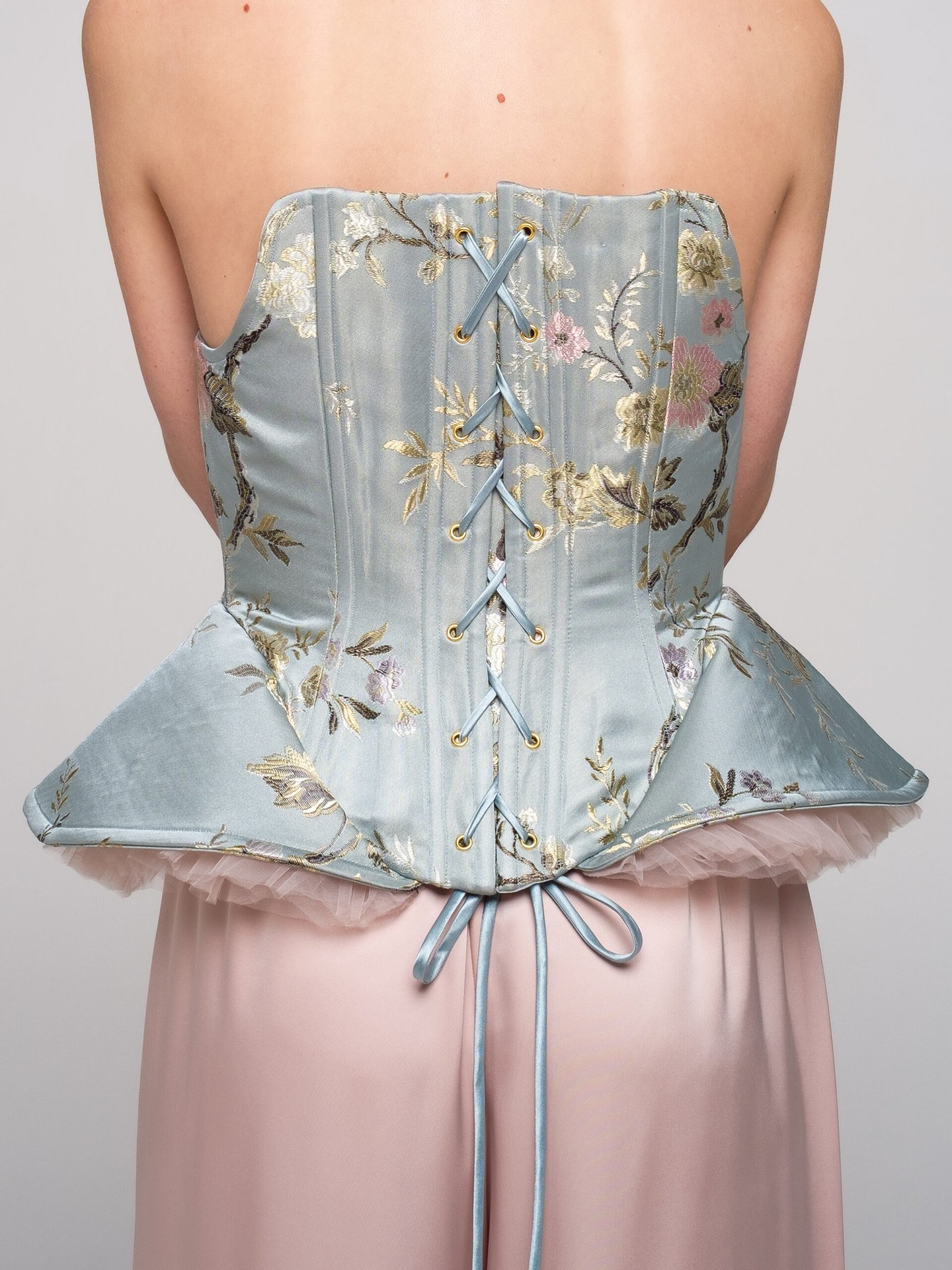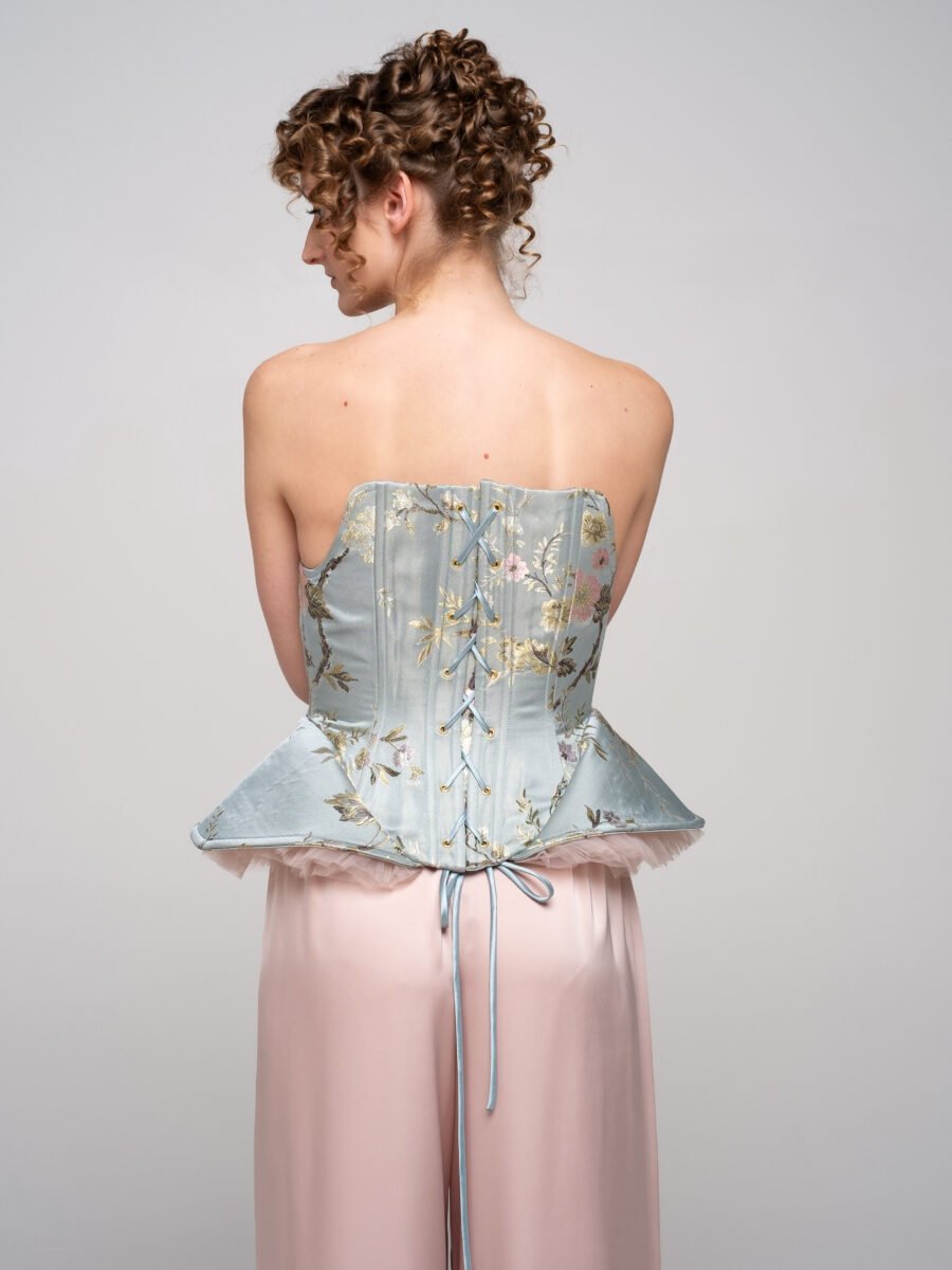 A structured couture corset crafted from silk brocade layered over sheer tulle.