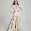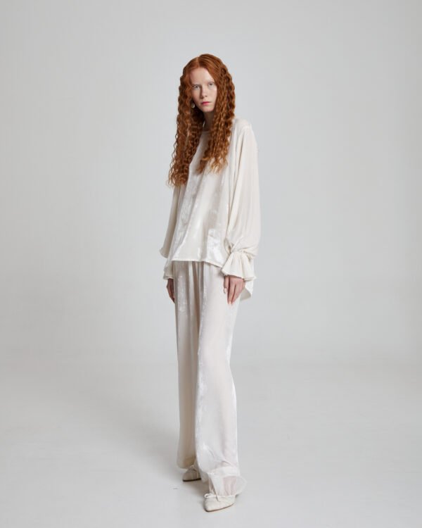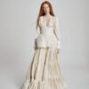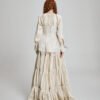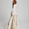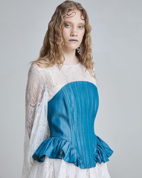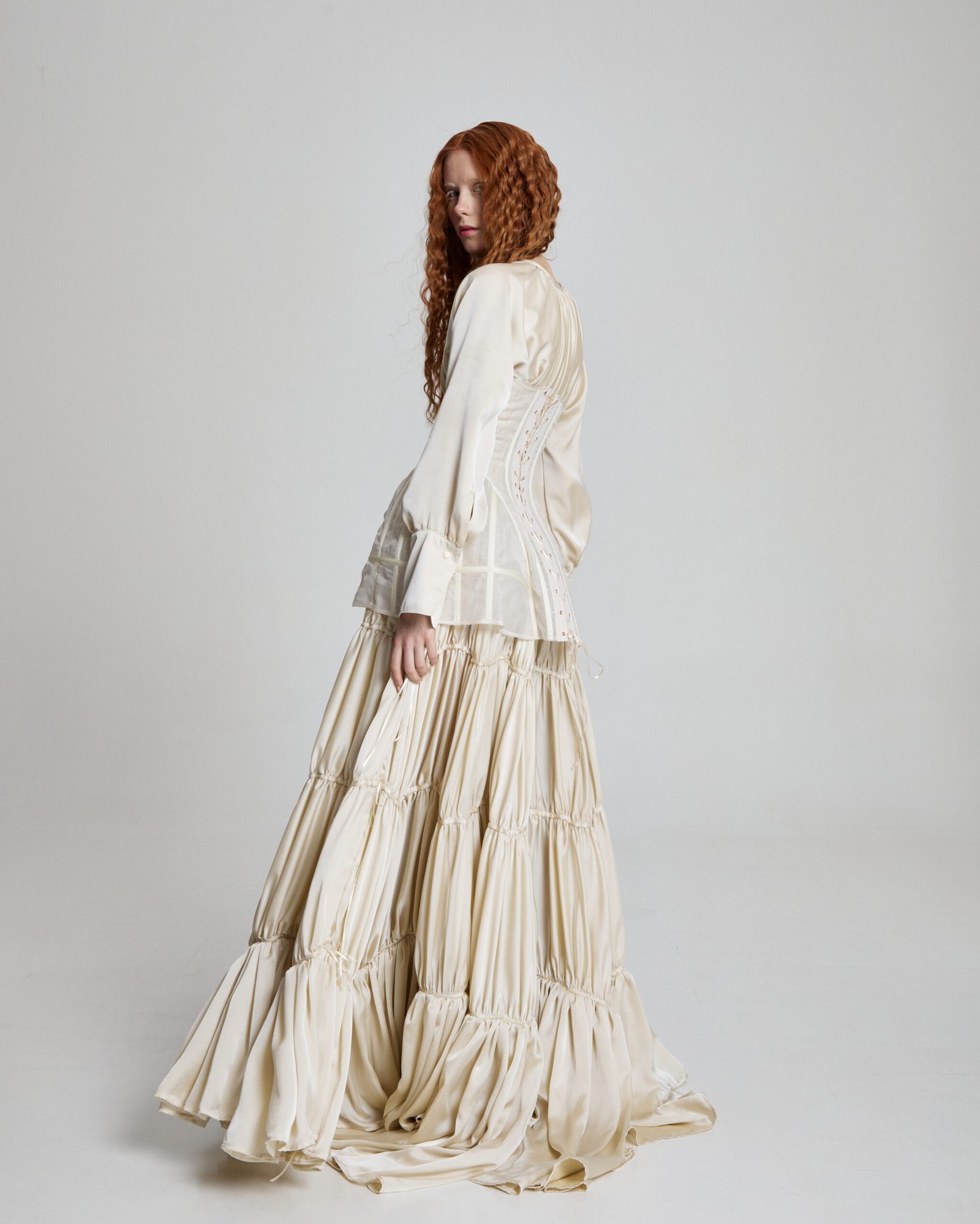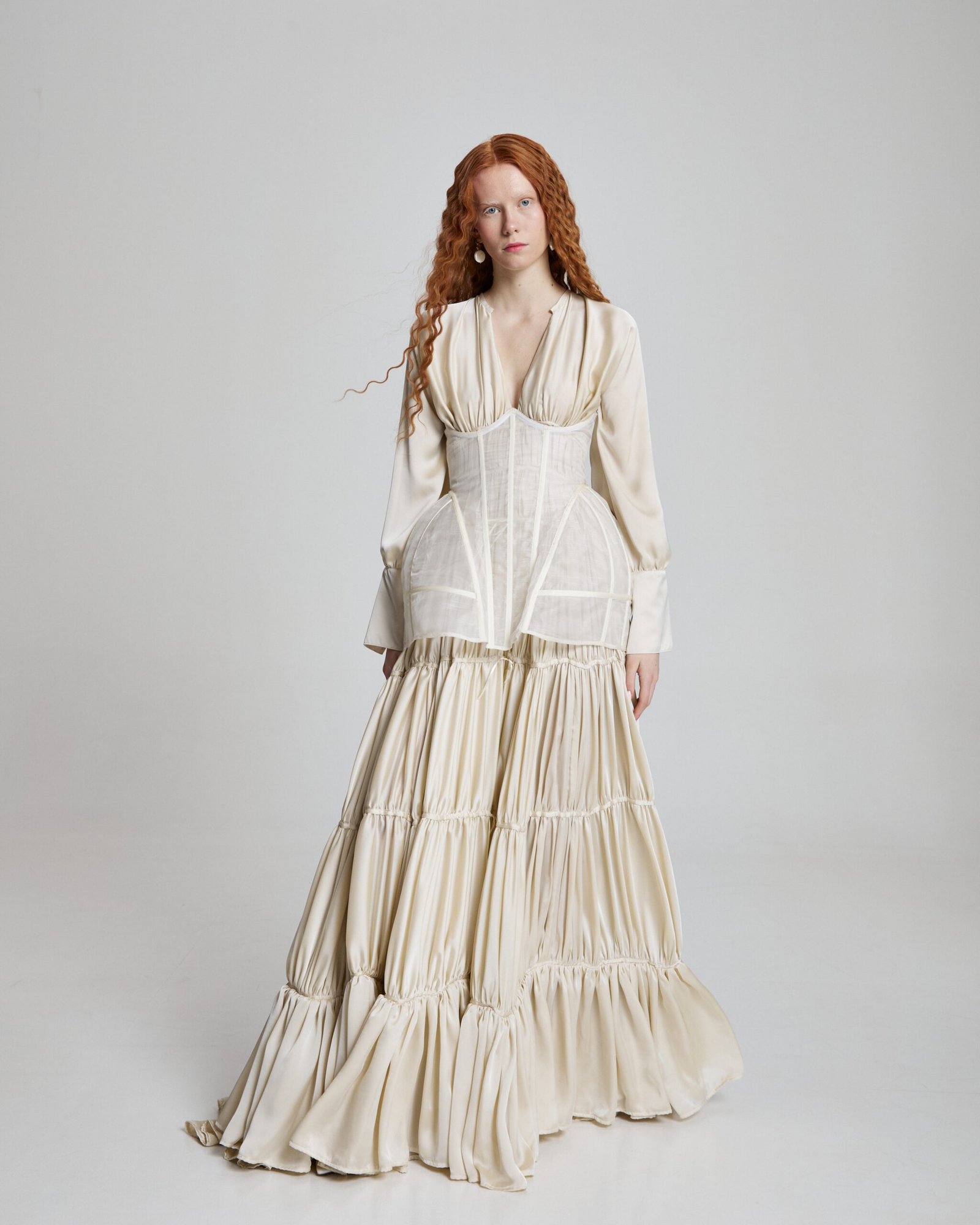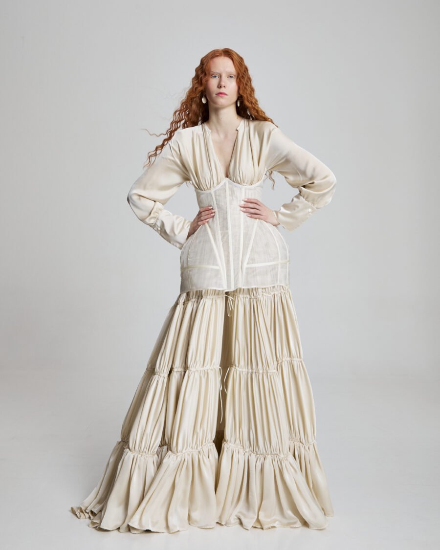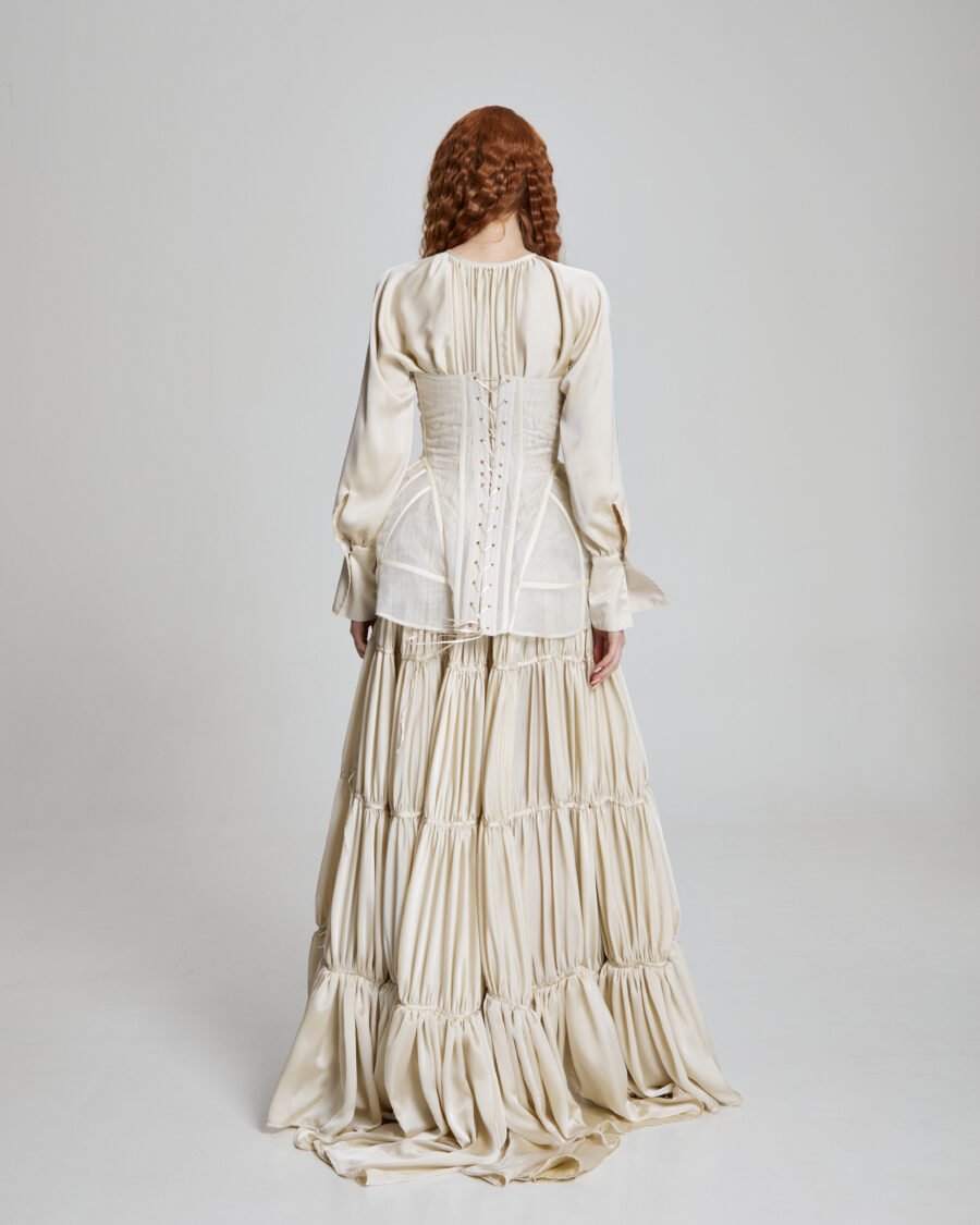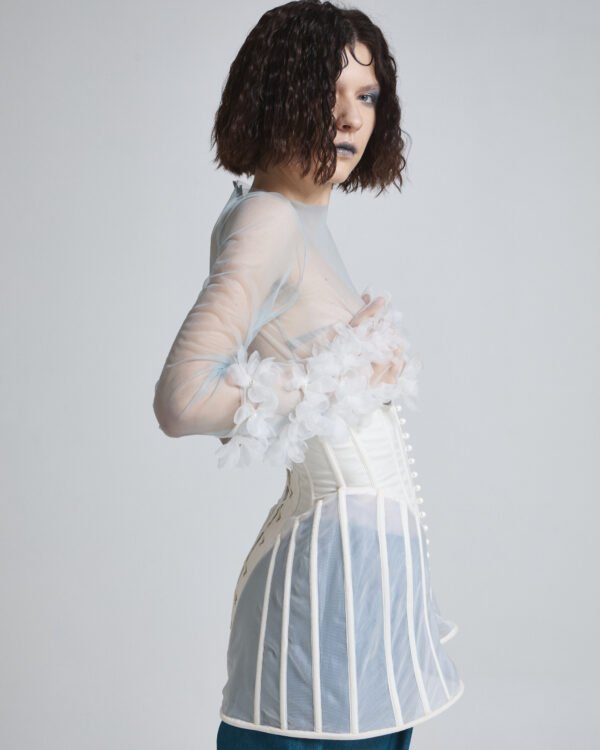 This corset is crafted from 100% Japanese silk organza in a soft champagne tone – airy yet architectural. The sheer construction reveals subtle layering beneath while maintaining sculpted definition through precise paneling and seam detailing.