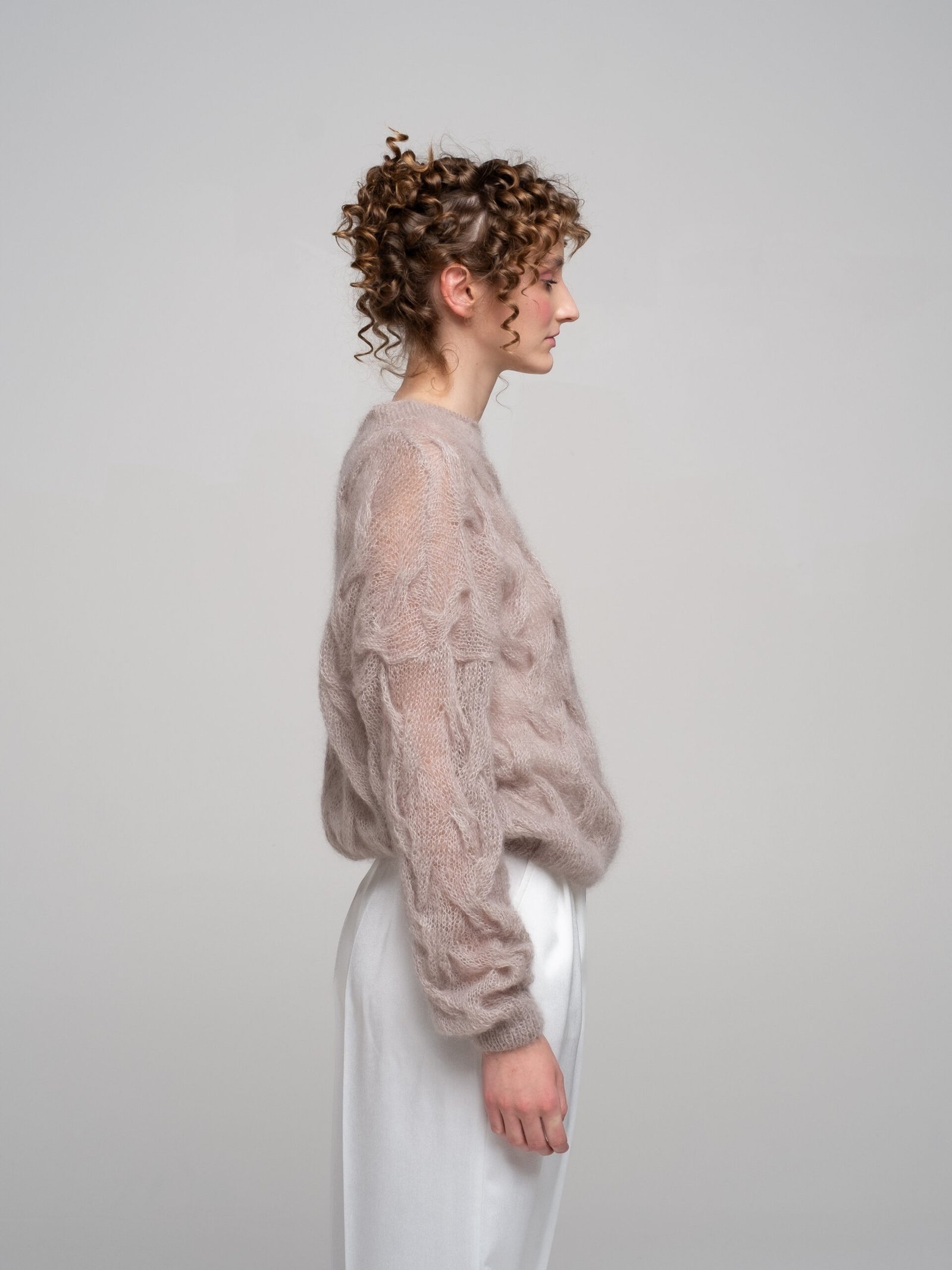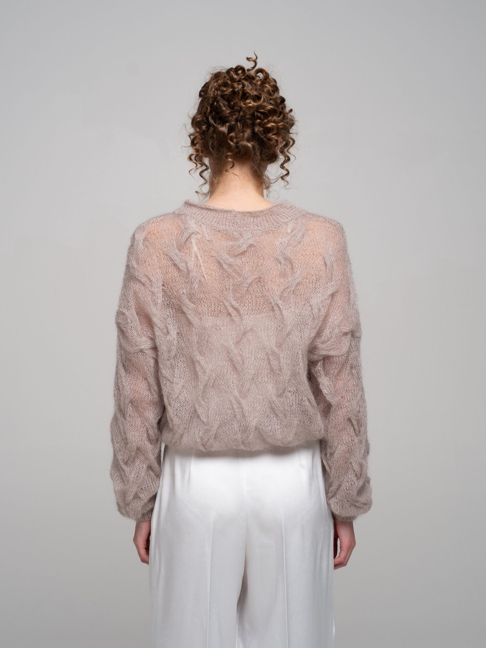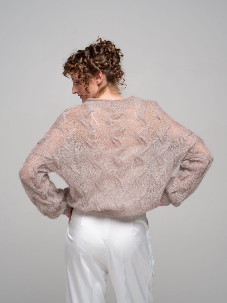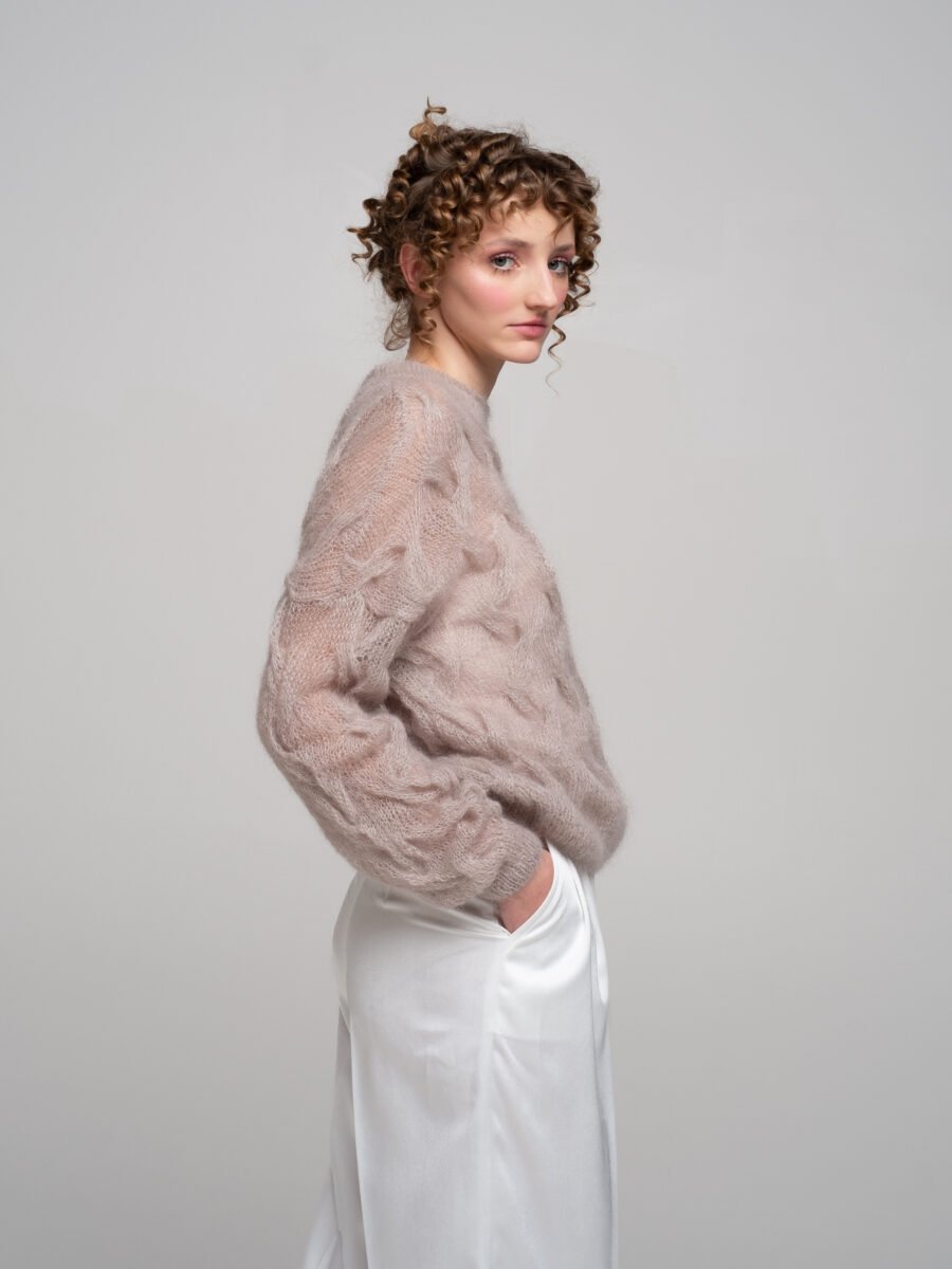 A soft, airy light mocha kid mohair sweater that feels like a gentle cloud. The oversized shape and rich all-over braid knit texture (covering the body and sleeves) bring cozy elegance and effortless style – fluffy, lightweight, and perfect for everyday layering.