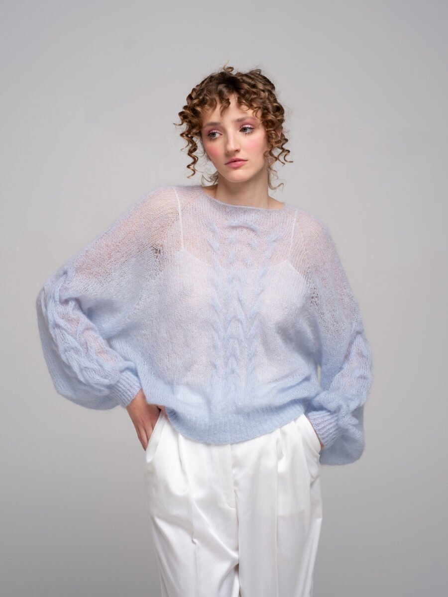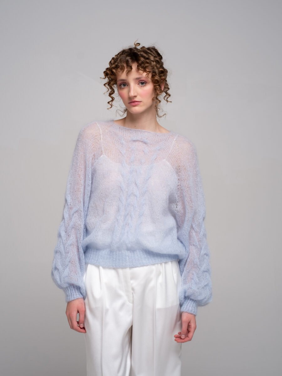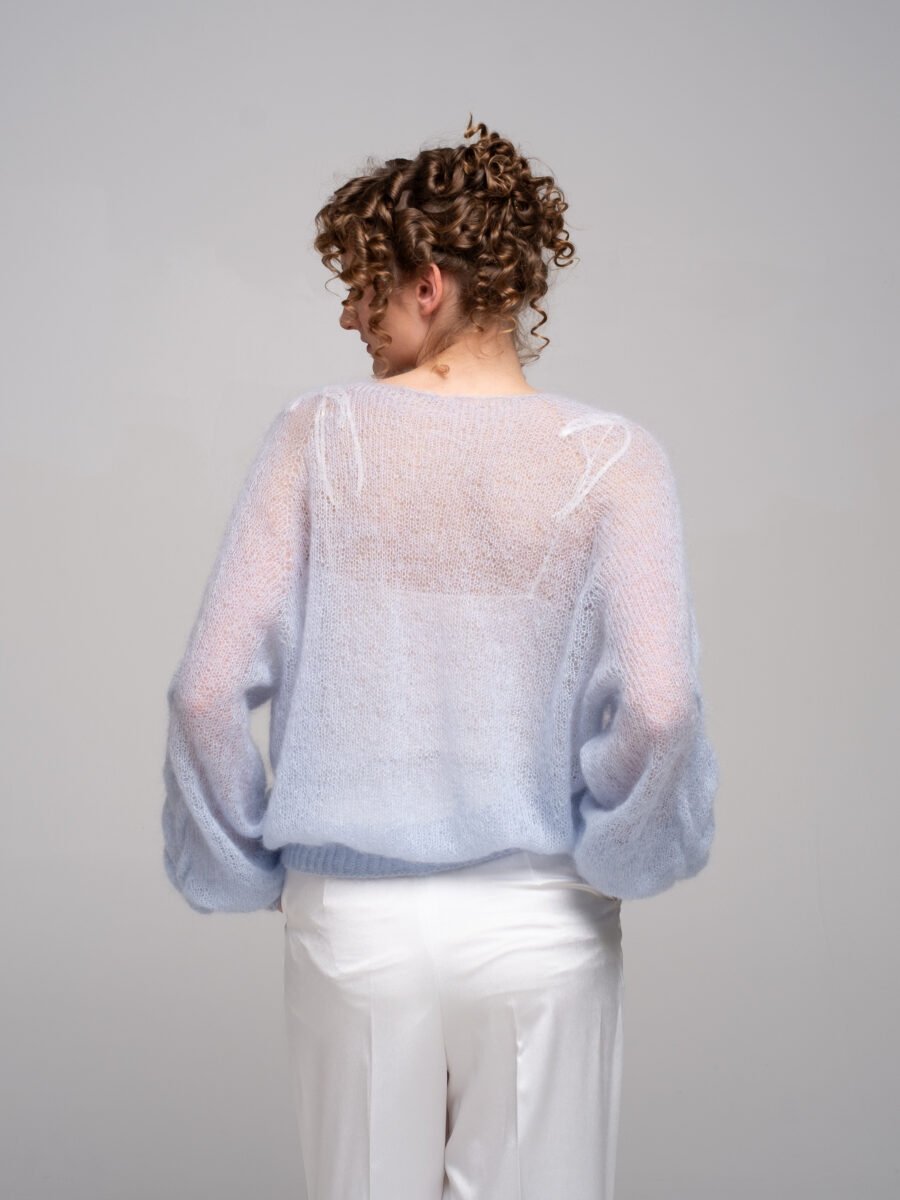 This hand-knitted kid mohair sweater in gentle pastel blue is pure lightness and comfort.