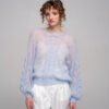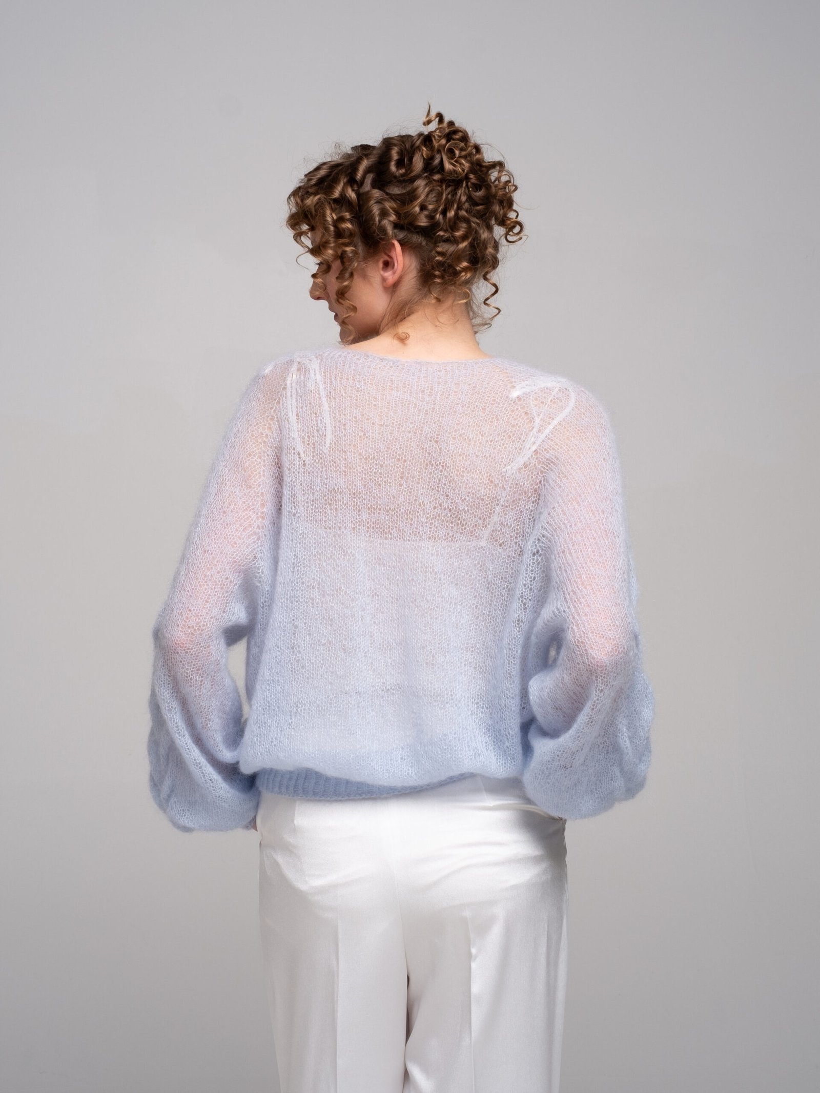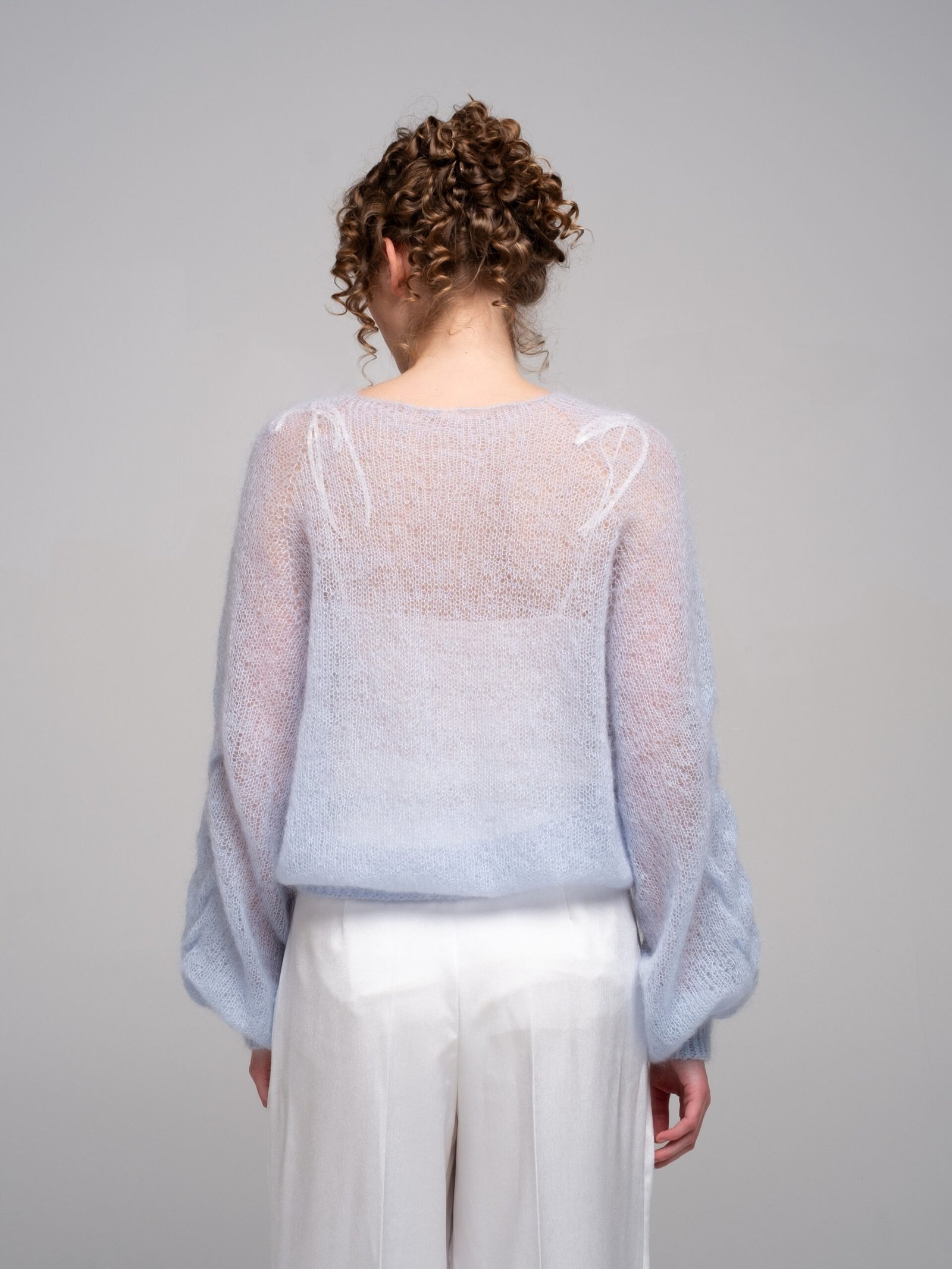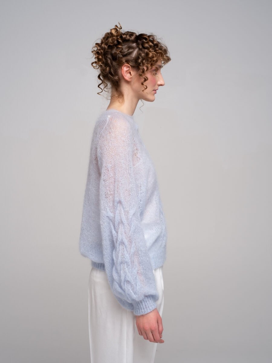 This hand-knitted kid mohair sweater in gentle pastel blue is pure lightness and comfort.