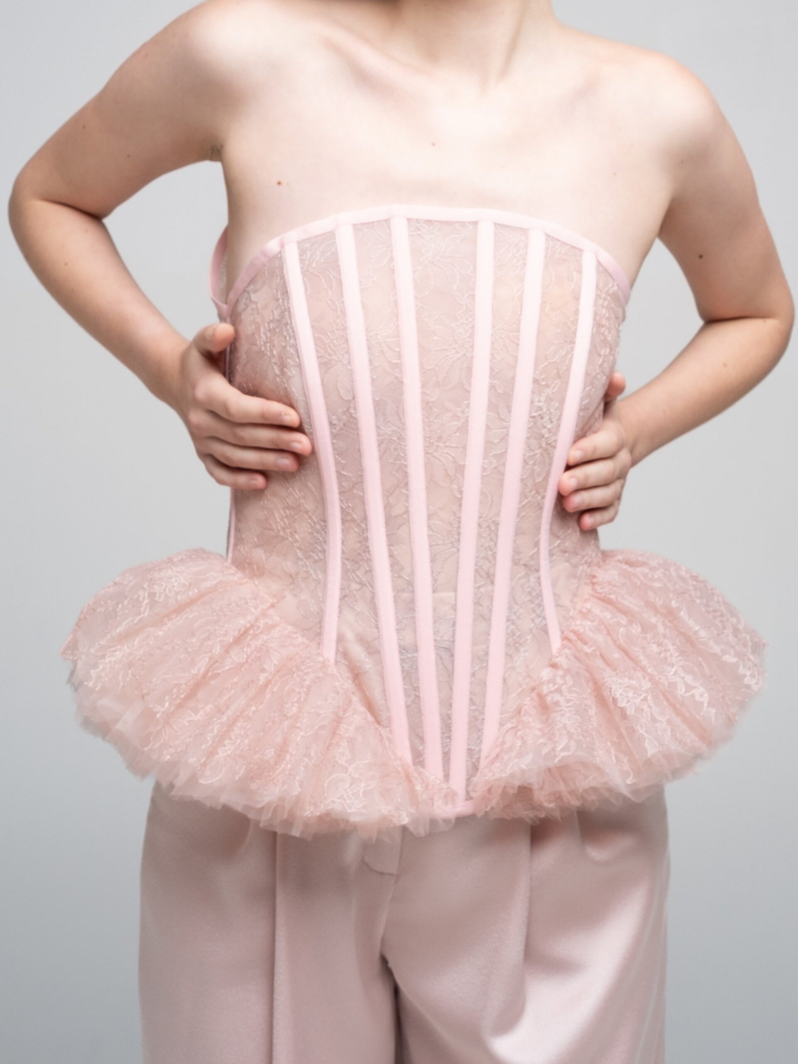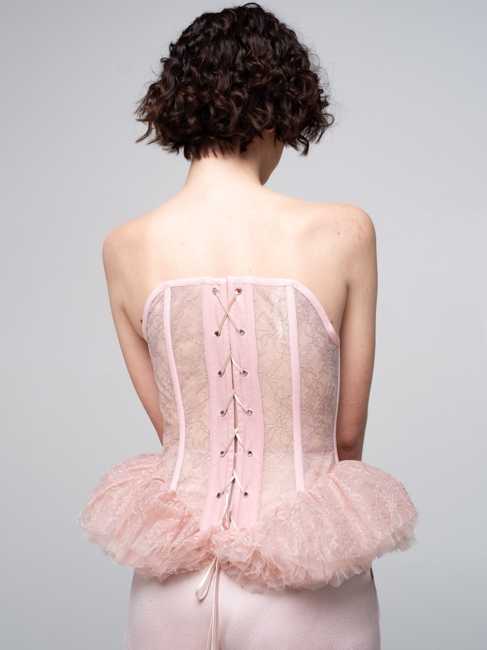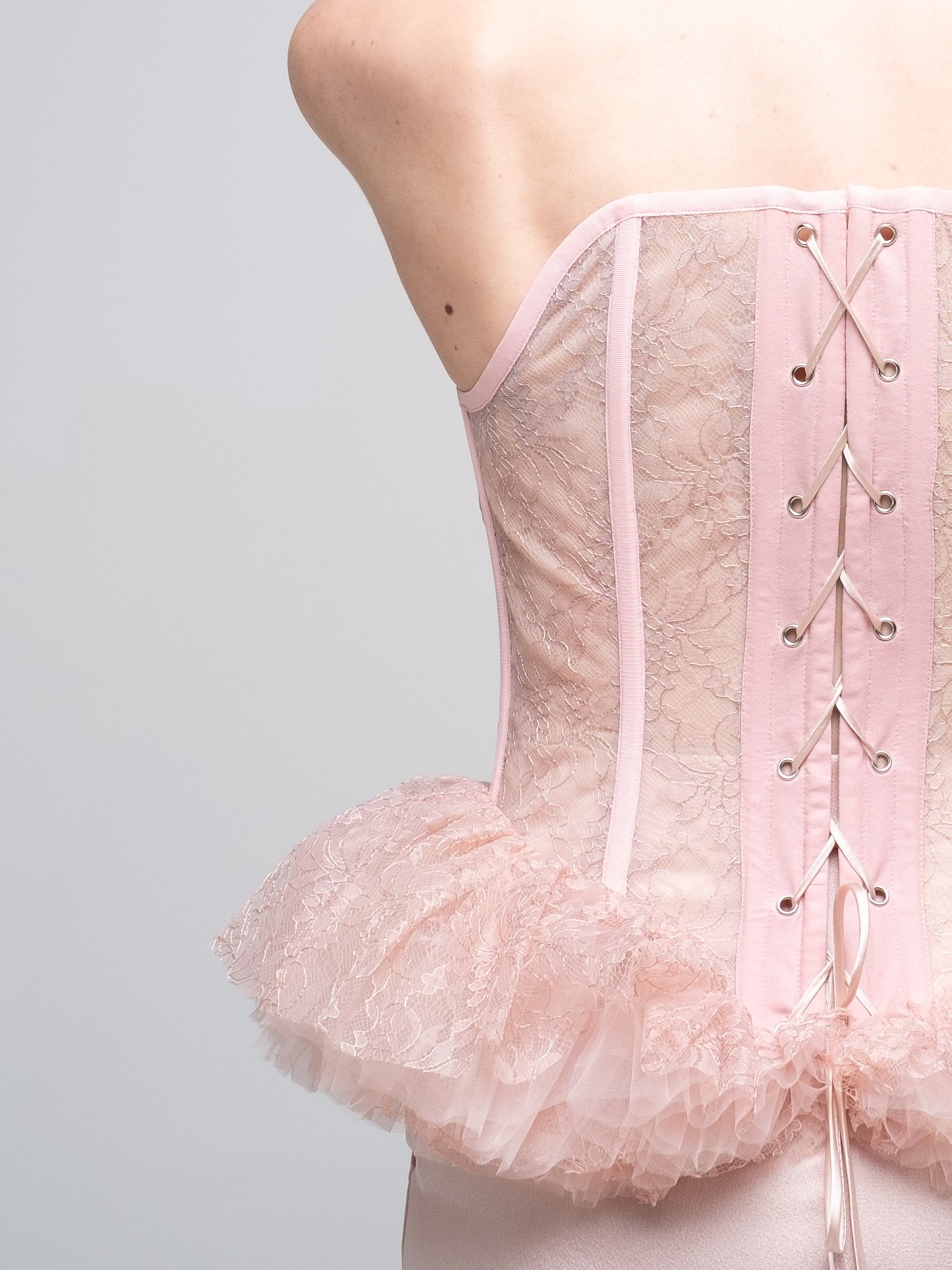 Vertical boning channels shape the silhouette while maintaining lightness and transparency. The waist extends into a sculptural ruffled peplum in soft dust pink, creating contrast between precision and delicacy.