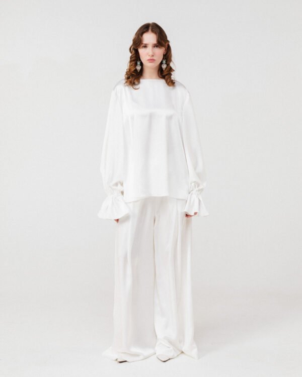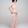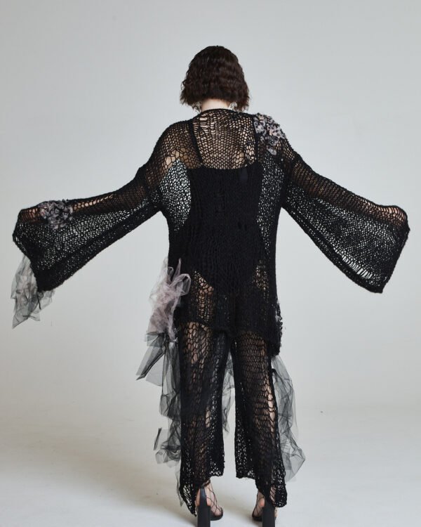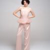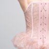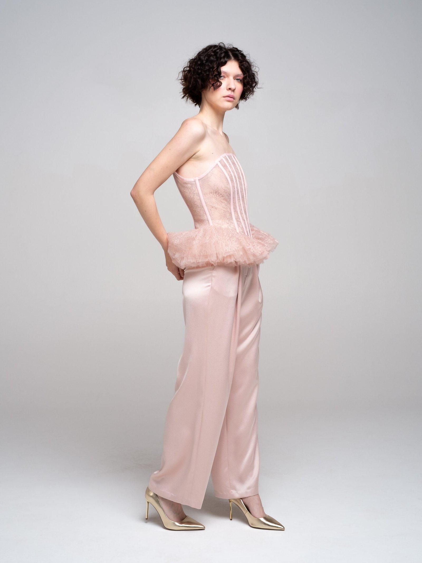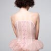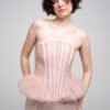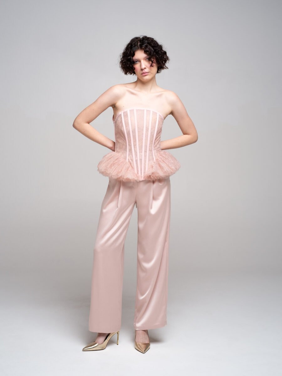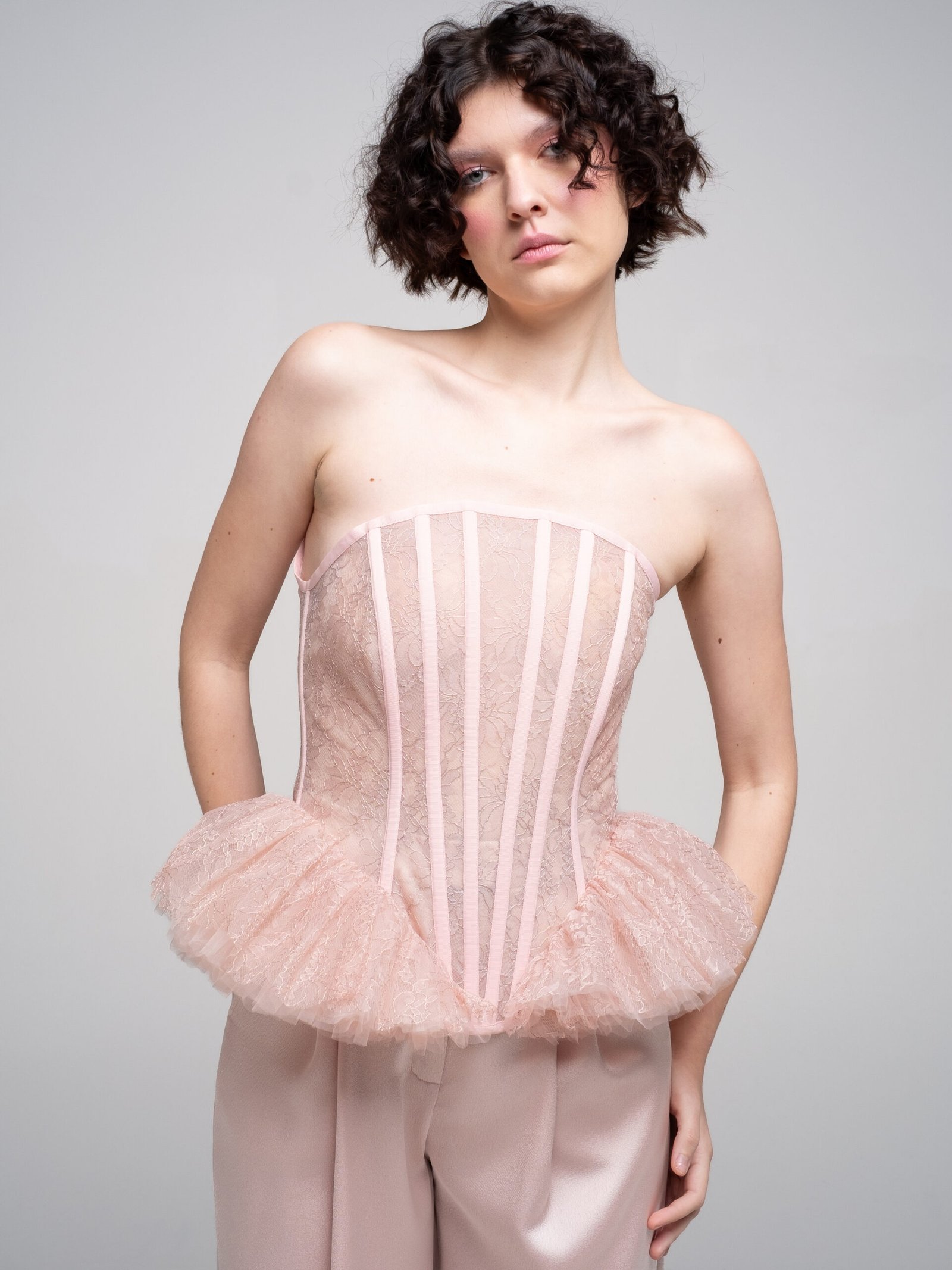 Vertical boning channels shape the silhouette while maintaining lightness and transparency. The waist extends into a sculptural ruffled peplum in soft dust pink, creating contrast between precision and delicacy.