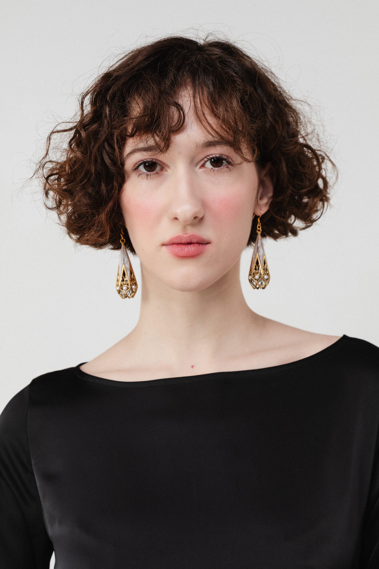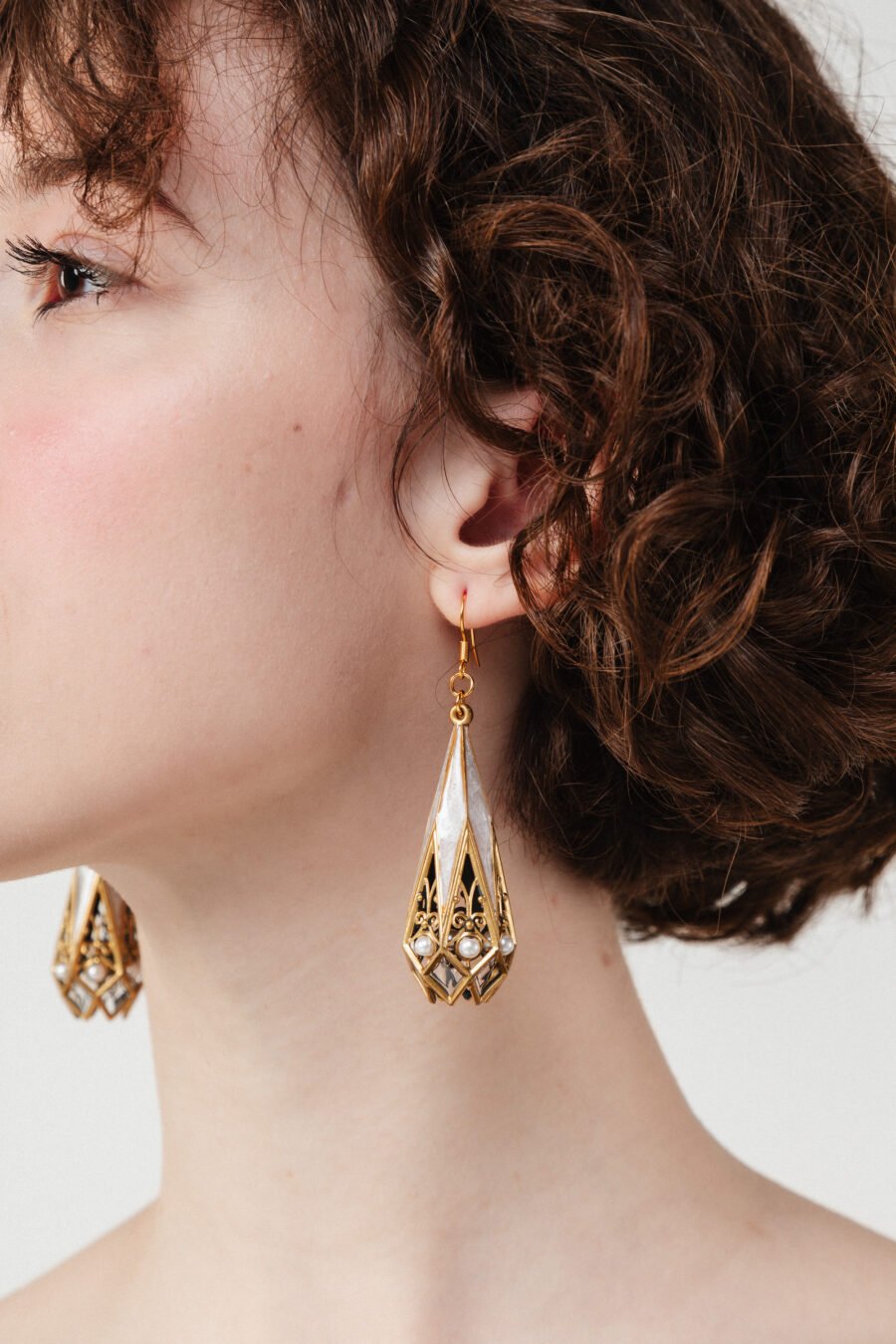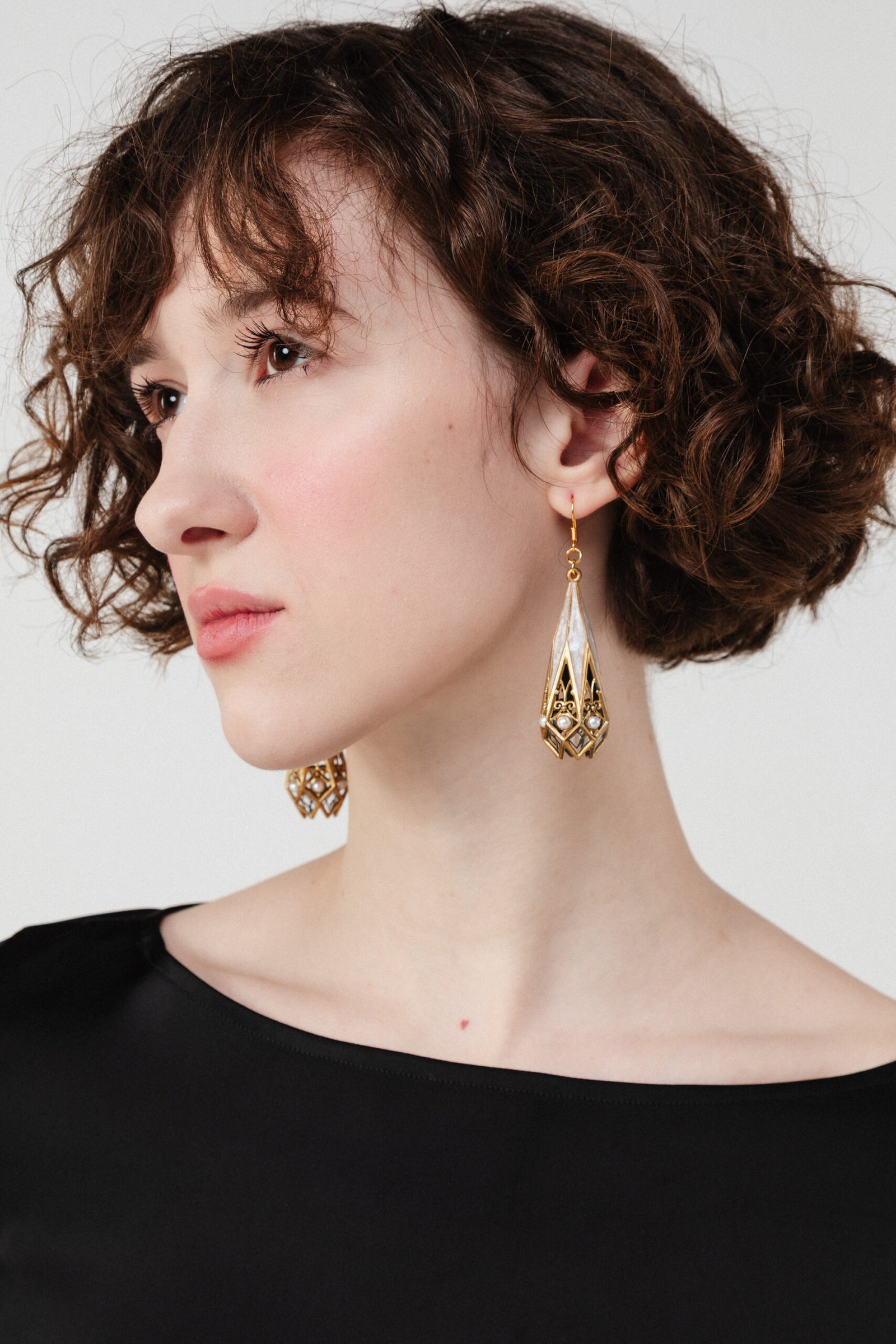 Finished in radiant gold and layered with luminous ivory enamel, these earrings are accented with delicate faux pearl clusters that soften the architectural structure. The glass-like UV resin creates subtle depth and glow, while the openwork filigree keeps the silhouette elegant and airy.