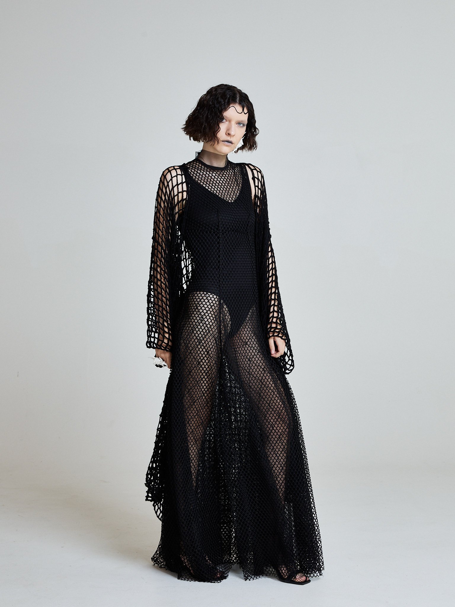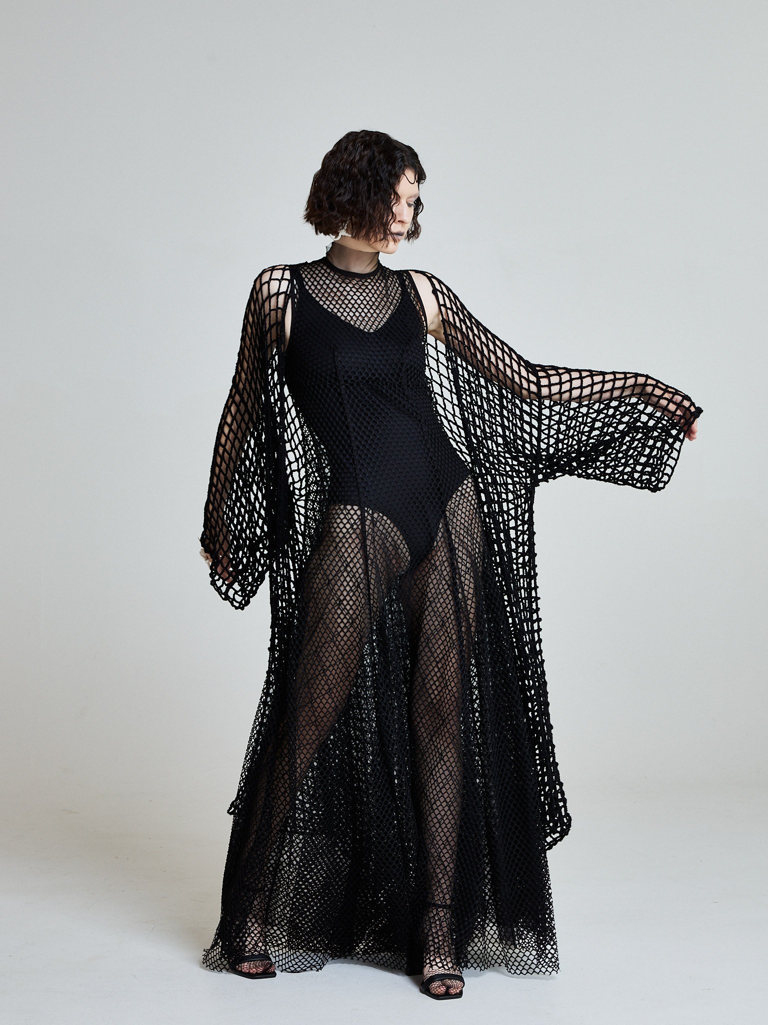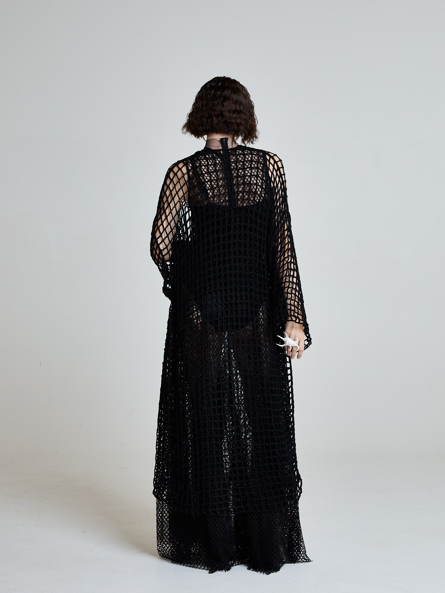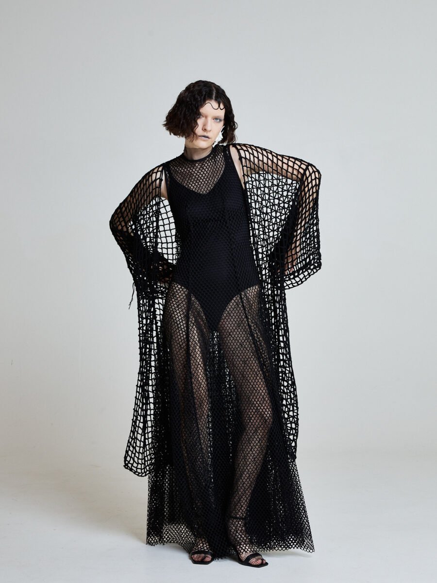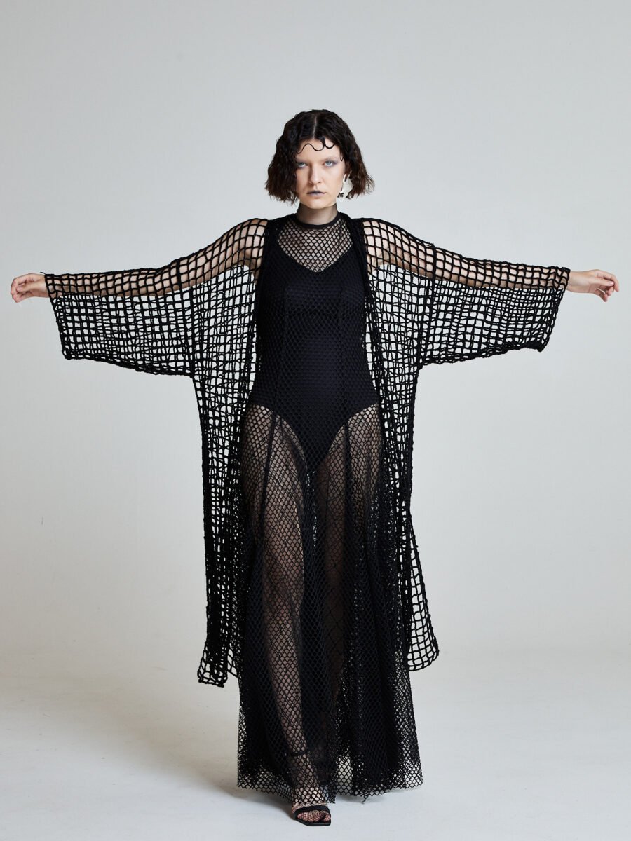The Midnight Net Robe is hand-crocheted from 100% cotton in an open net structure inspired by fishermen casting lines under moonlight. The silhouette is elongated and fluid, with extended wide sleeves that create wing-like movement.