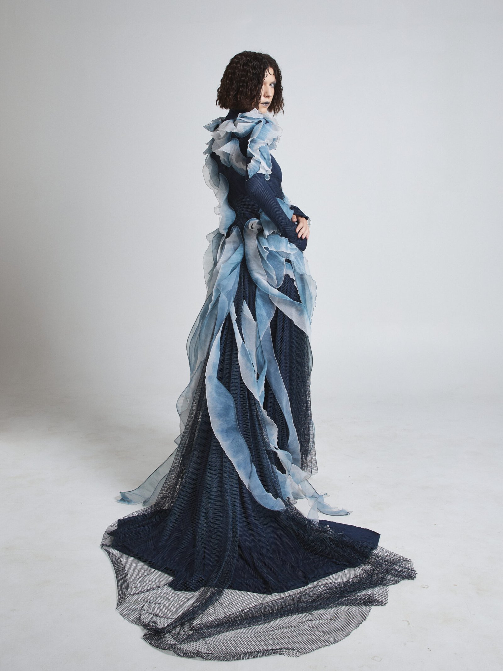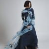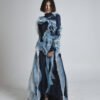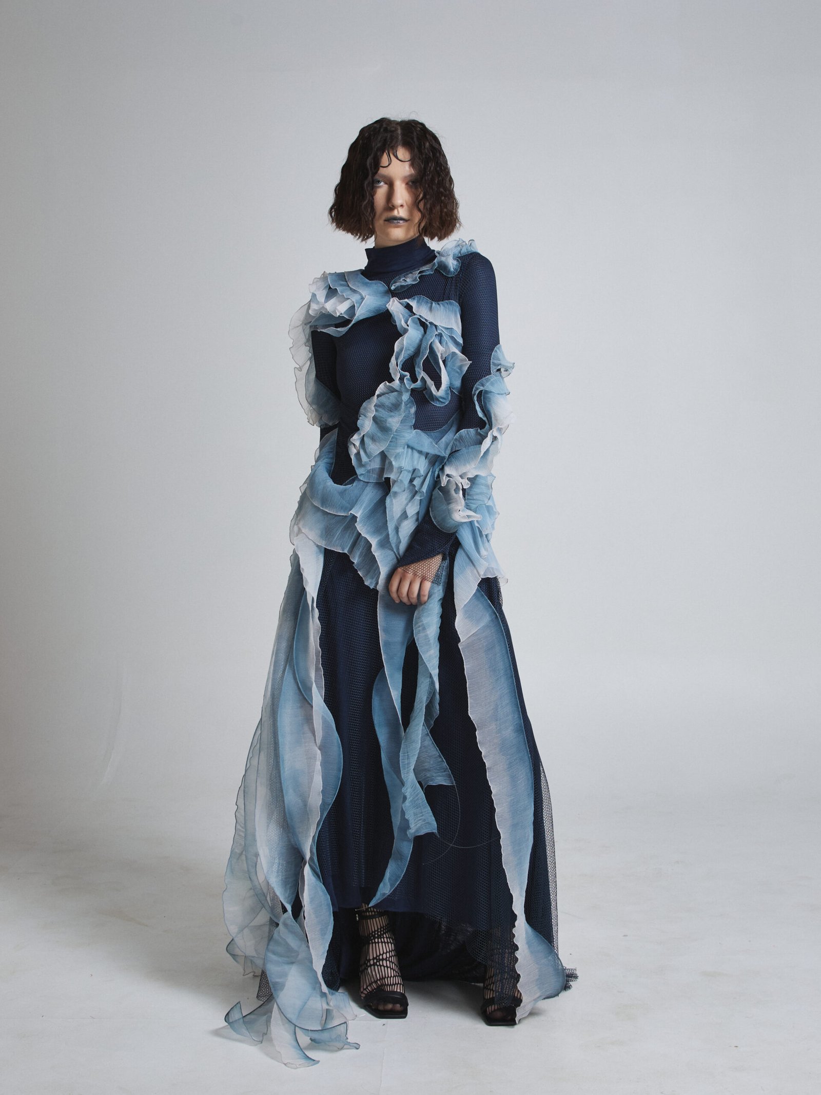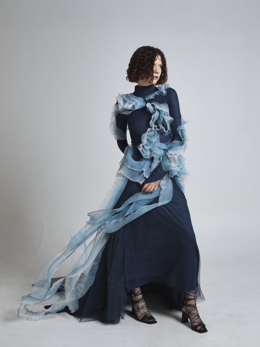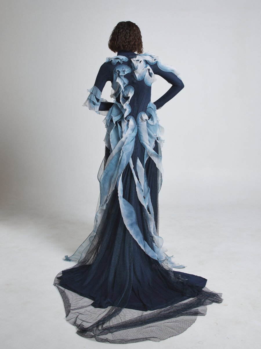 The sheer outer layer flows in seaweed-like formations, finished with hand-painted silk accents that create depth and organic motion. The layered textures cascade along the body, shifting shape with every step.
