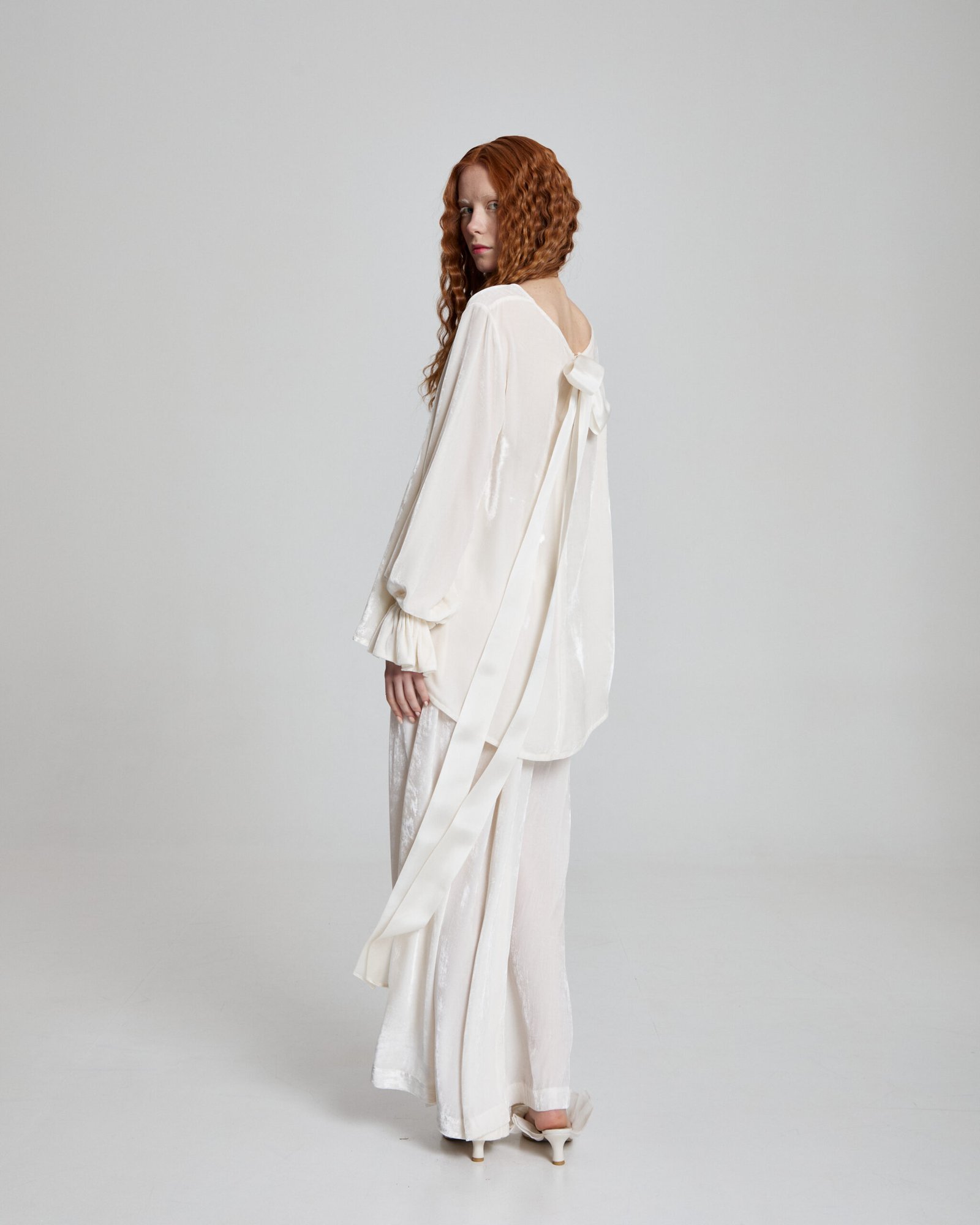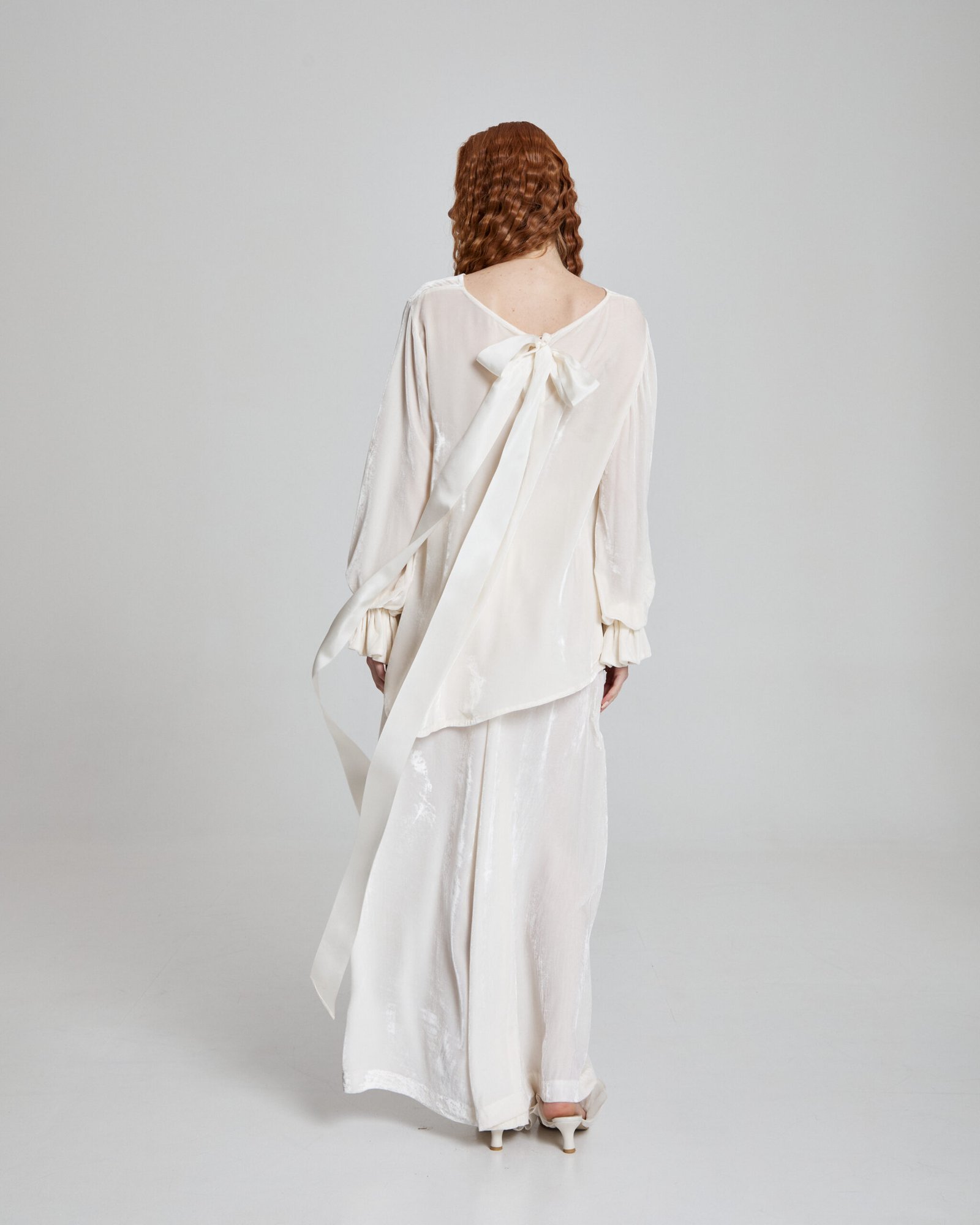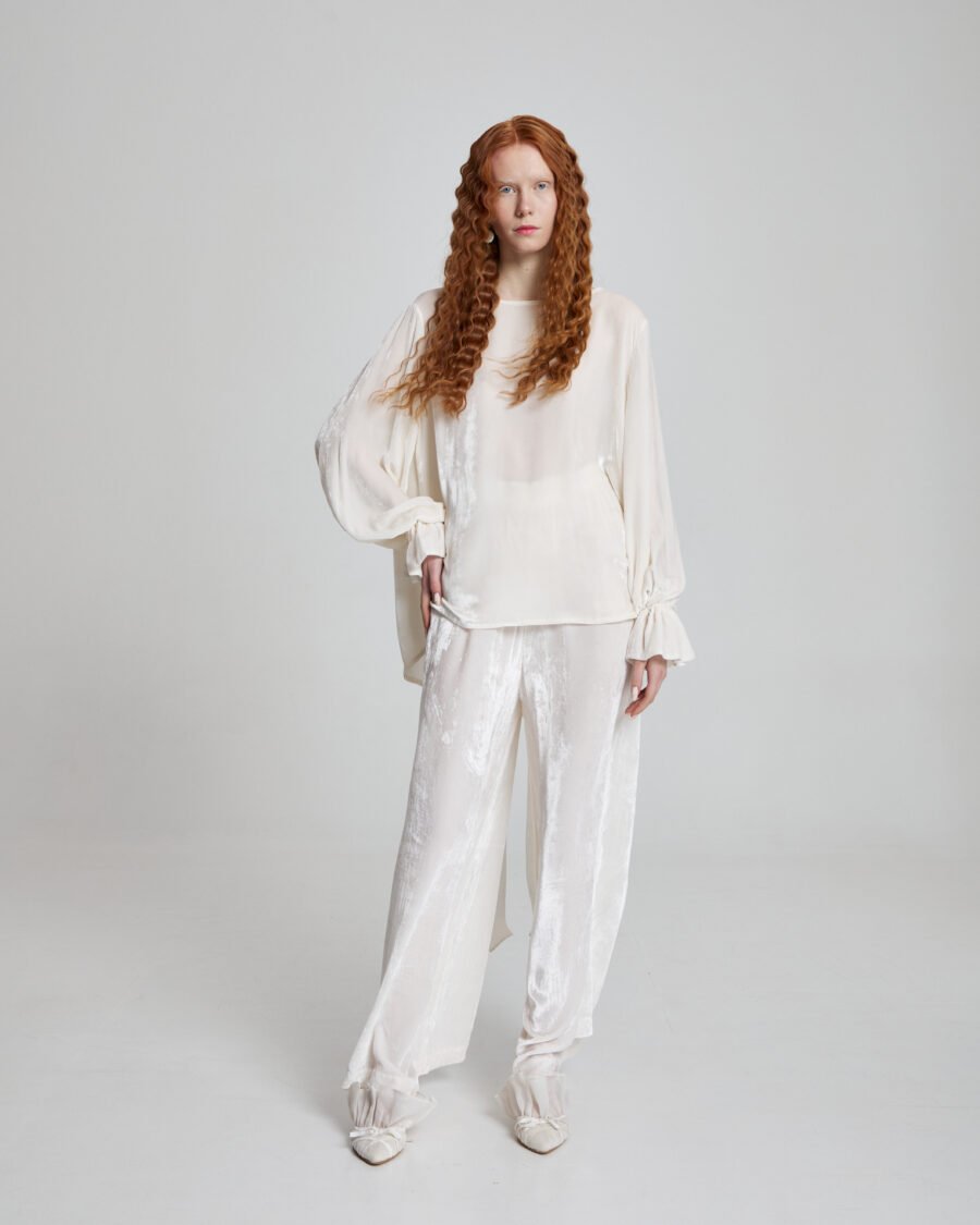 This sheer silk velvet top is crafted from 100% silk, offering a luminous drape and fluid silhouette. Finished with a statement bow detail at the back, it blends softness with sculptural elegance for a refined yet modern look.