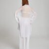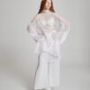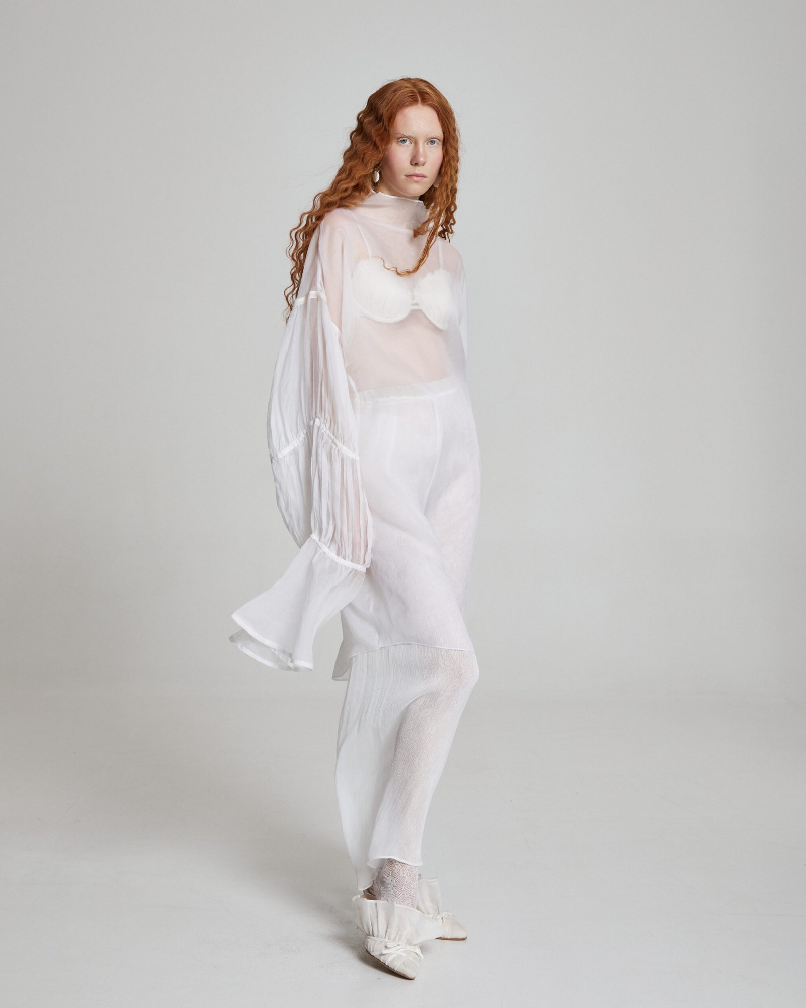 Crafted from 100% silk organza, this blouse balances crispness with weightless movement. The sheer body reveals subtle layering beneath, while the hand-pleated sleeve details introduce texture and dimension.