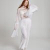 The silhouette is fluid yet intentional — high neckline, elongated sleeves, and soft volume that frames the body without overwhelming it. The pleating is done by hand, creating gentle architectural rhythm through the arms.