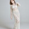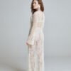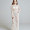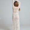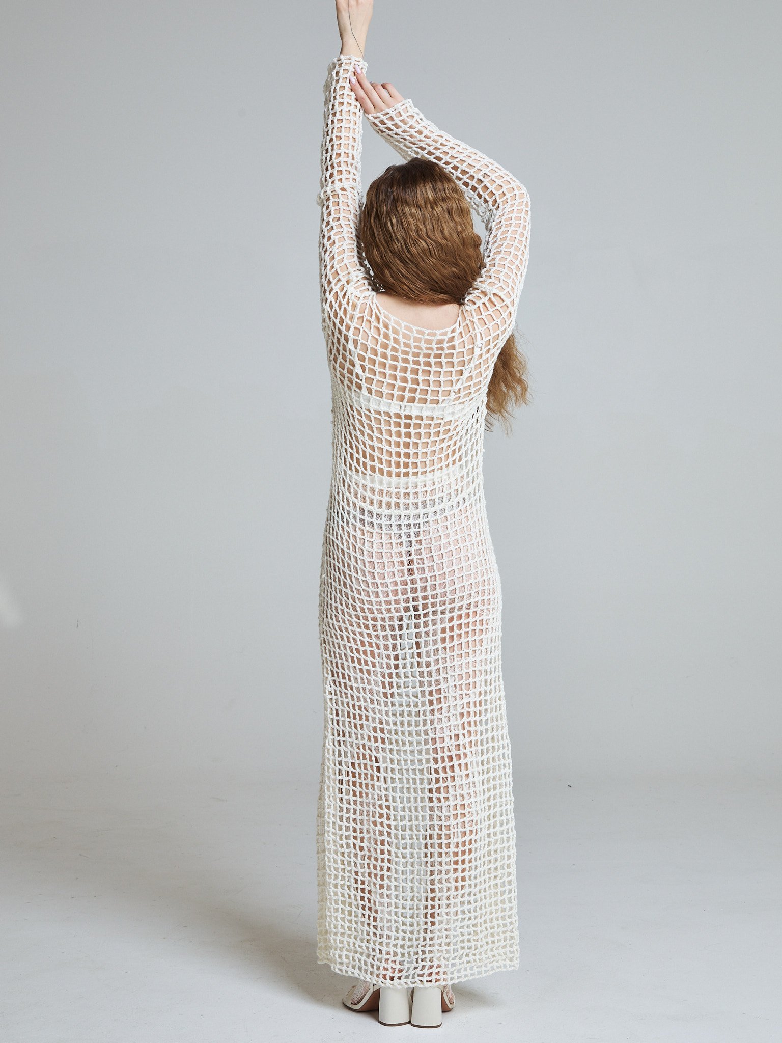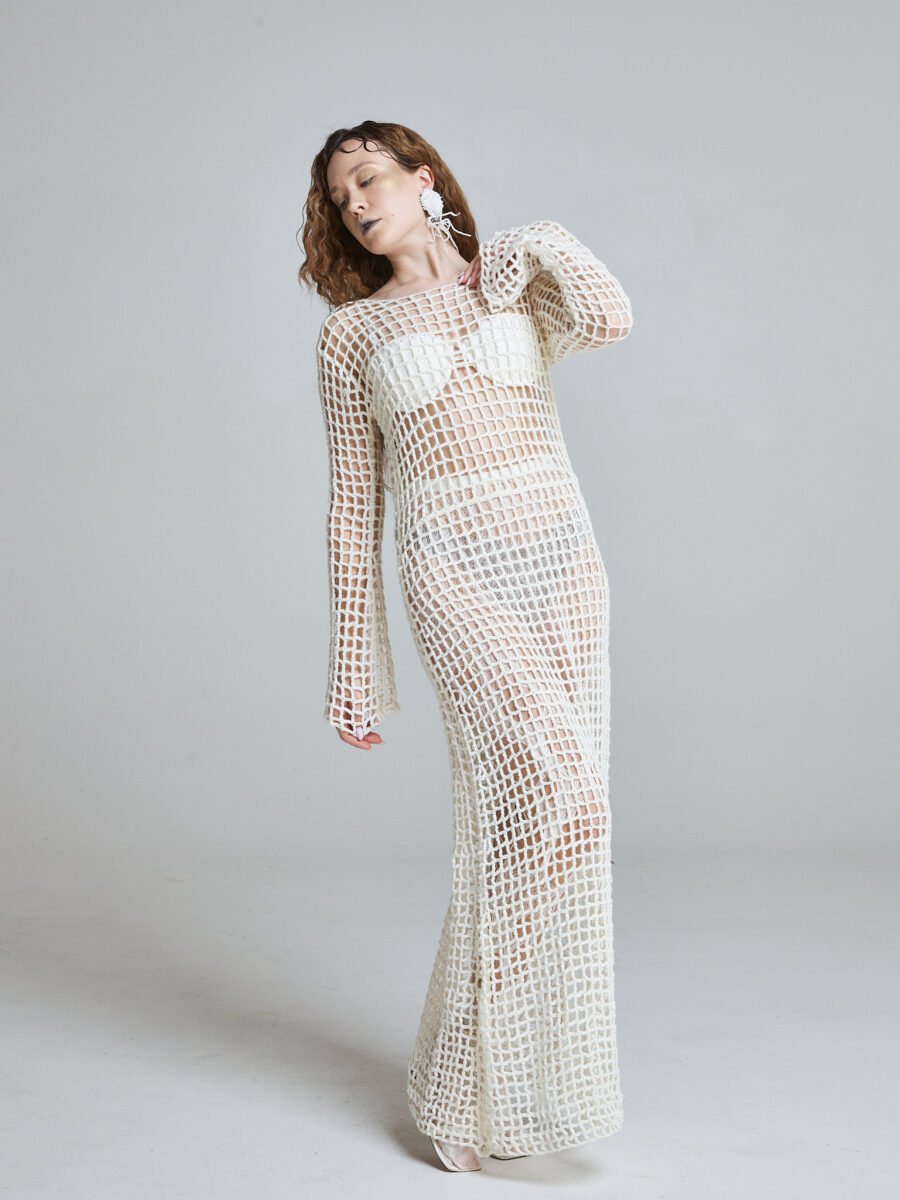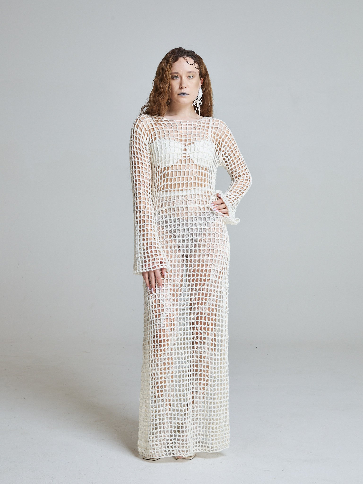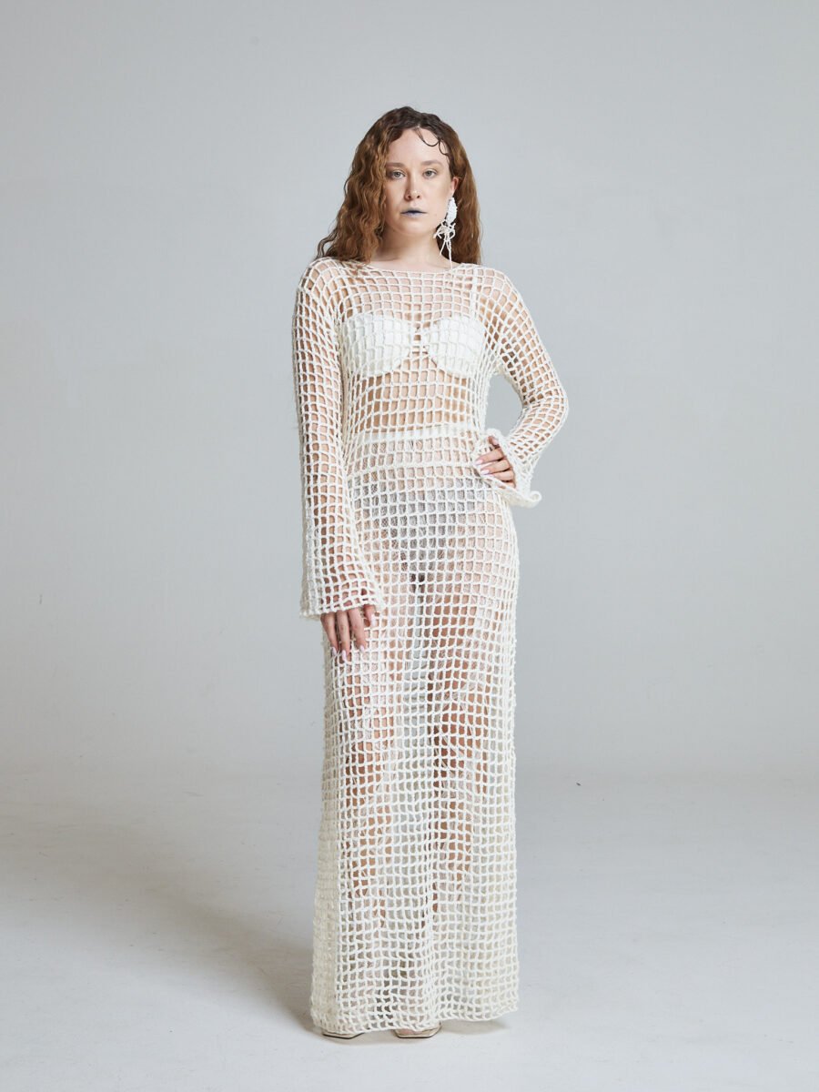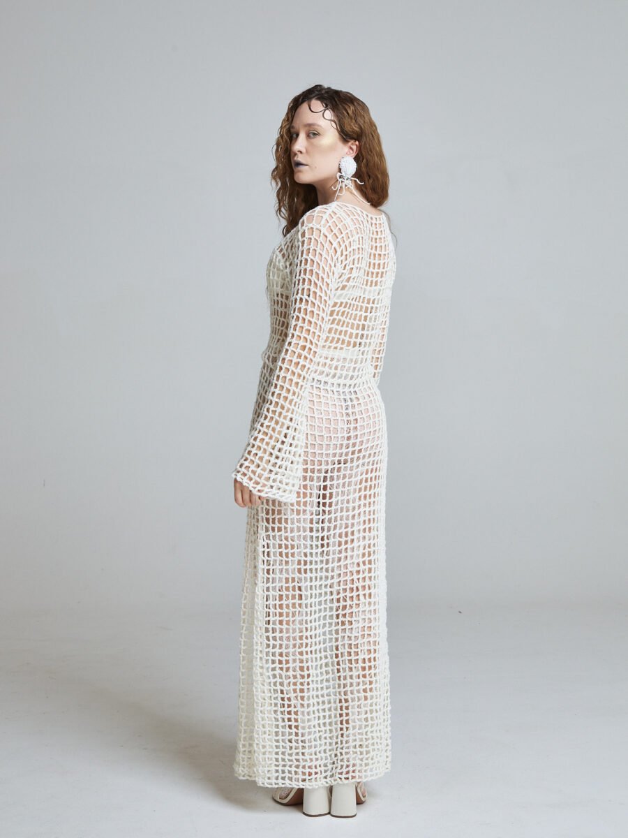 This hand crocheted dress is constructed in a wide net pattern inspired by traditional fishing grids. The elongated silhouette follows the body while maintaining transparency and airflow.