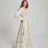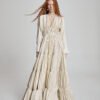 Crafted in fluid champagne satin, this adjustable maxi dress features a softly gathered bodice and tiered silhouette that moves with effortless elegance. The adjustable waist detailing allows for a customizable fit, enhancing shape while maintaining comfort.