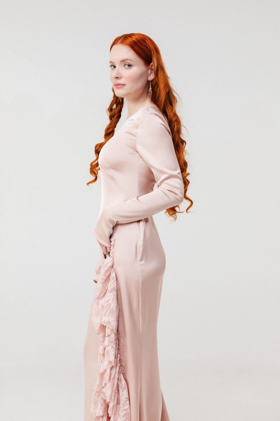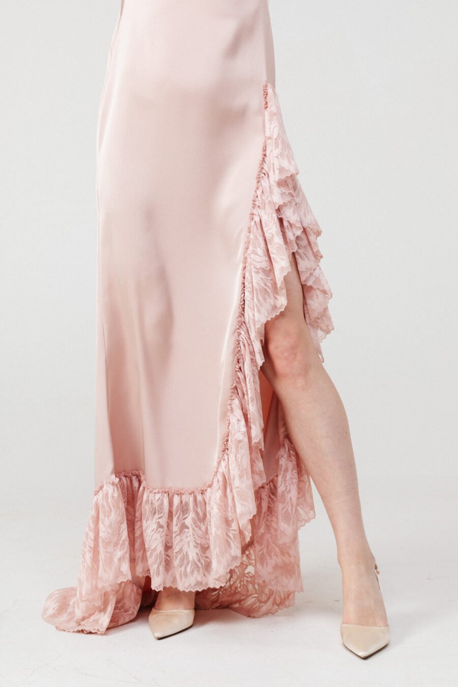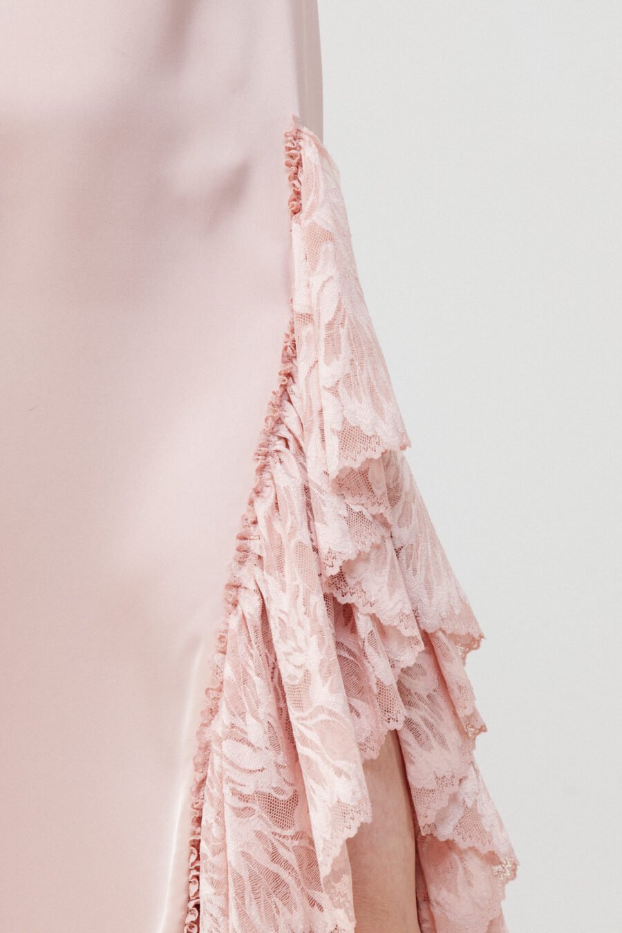 The silhouette elongates the figure while the fitted sleeves offer balance and modern restraint. The lace panel and hem create dimension and depth against the fluid satin surface.