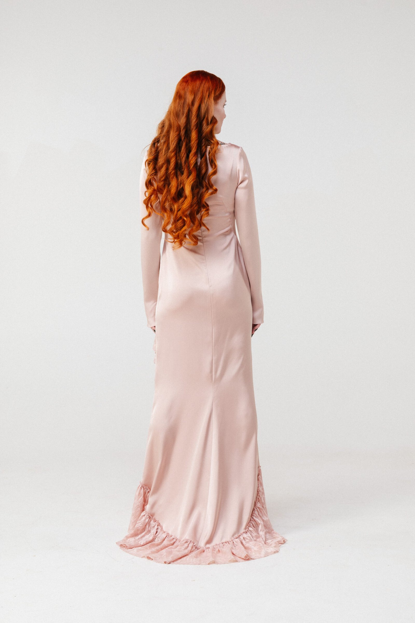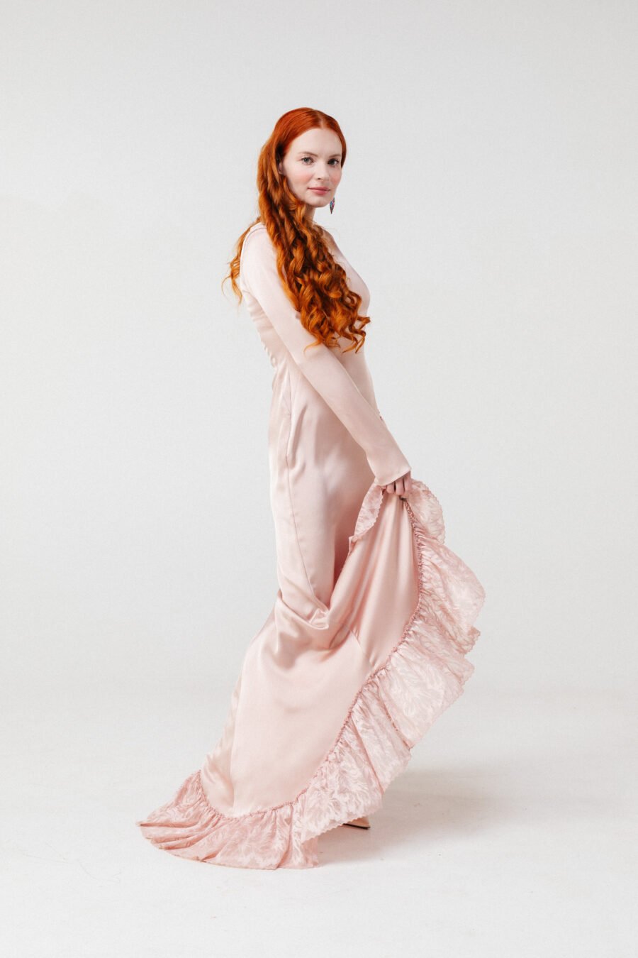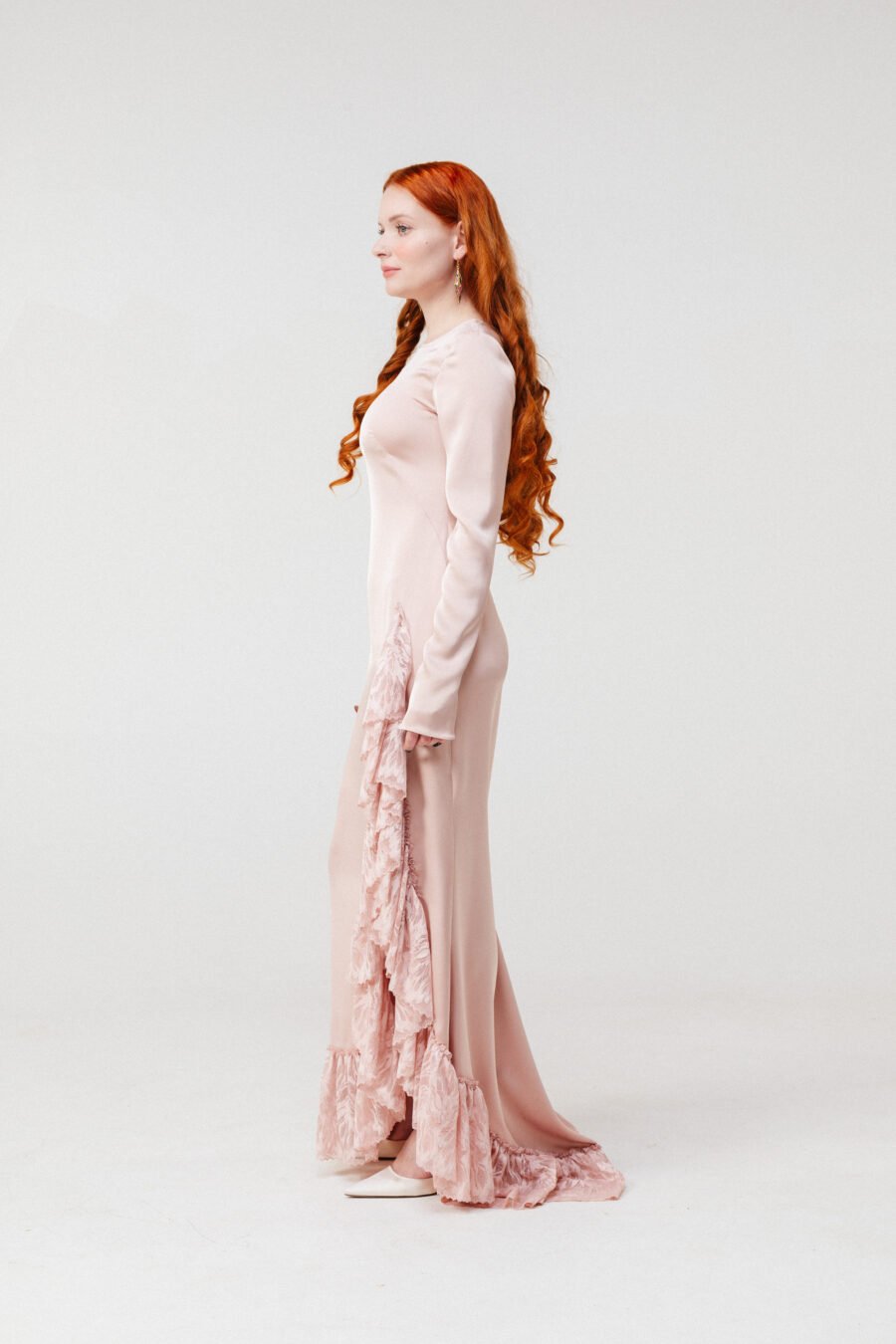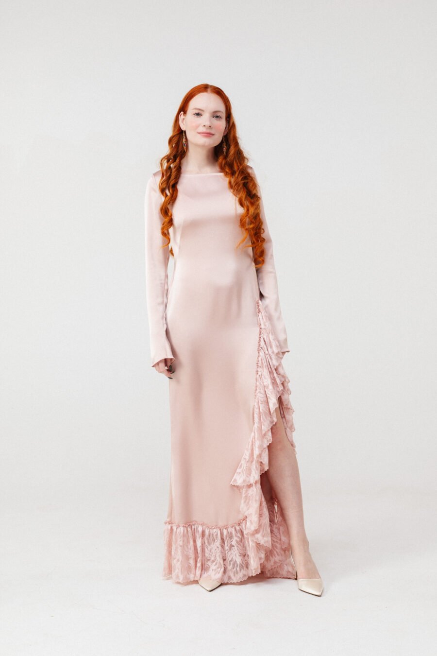 The silhouette elongates the figure while the fitted sleeves offer balance and modern restraint. The lace panel and hem create dimension and depth against the fluid satin surface.