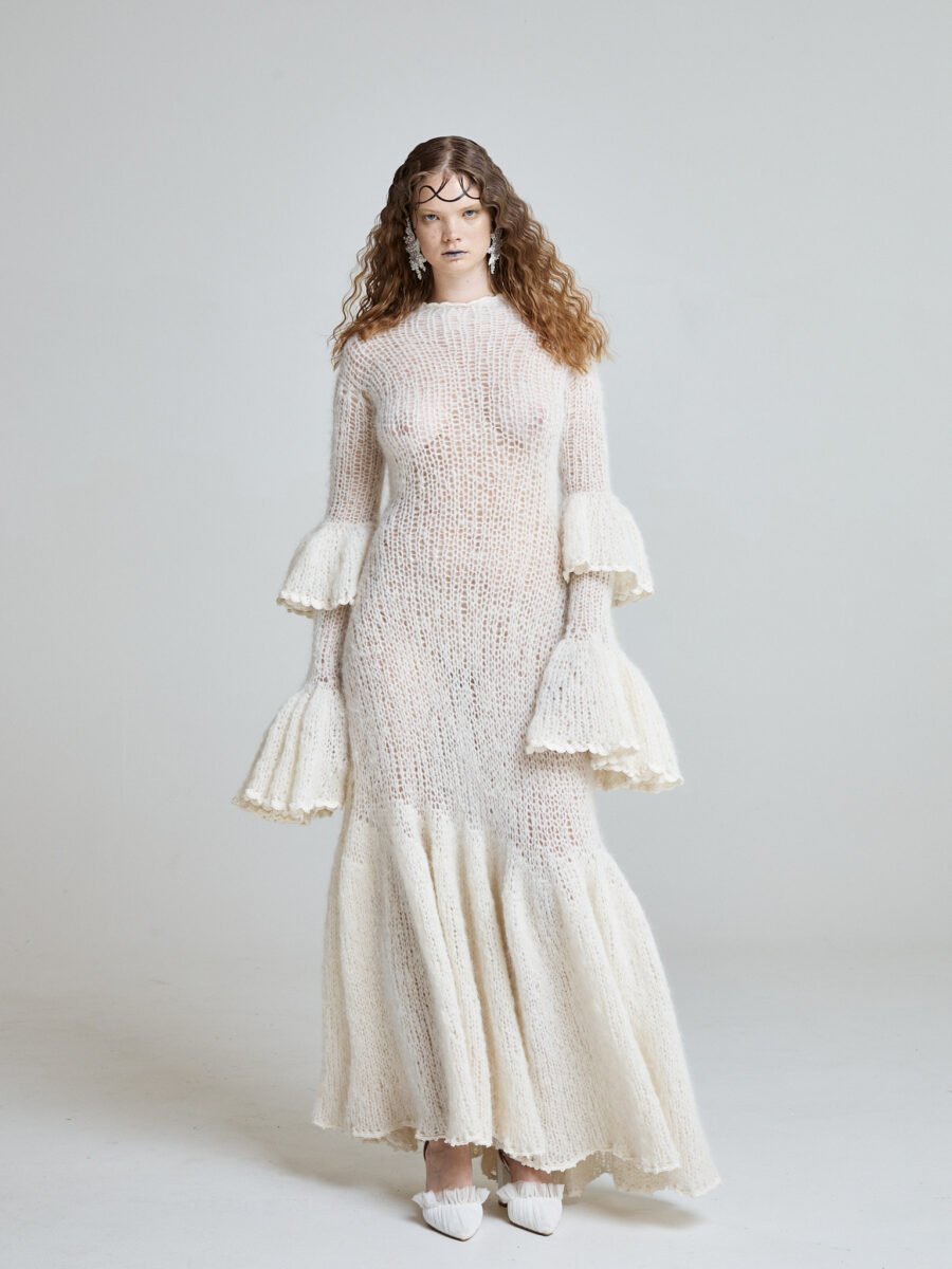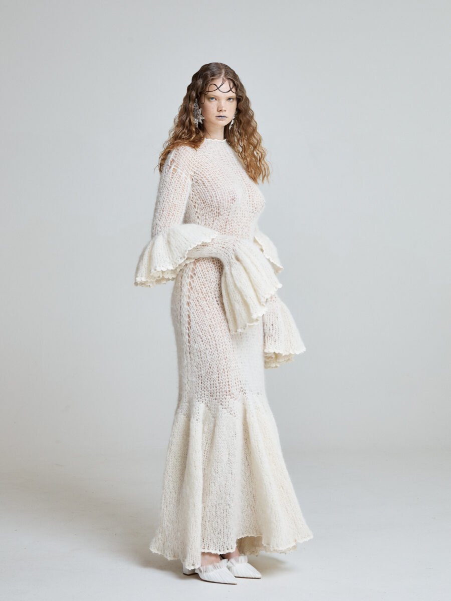 The Seafoam Flamenca Gown is hand knitted from luxurious kid mohair and angora, designed for winter brides who refuse to sacrifice elegance for warmth.