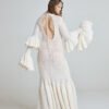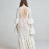 The fitted bodice follows the natural curve of the body before unfolding into a flared hem inspired by flamenco dancers in motion – dramatic, grounded, powerful. The sleeves echo this rhythm with tiered volume, finished with hand-crocheted scalloped lace trim crafted from silk and cotton.