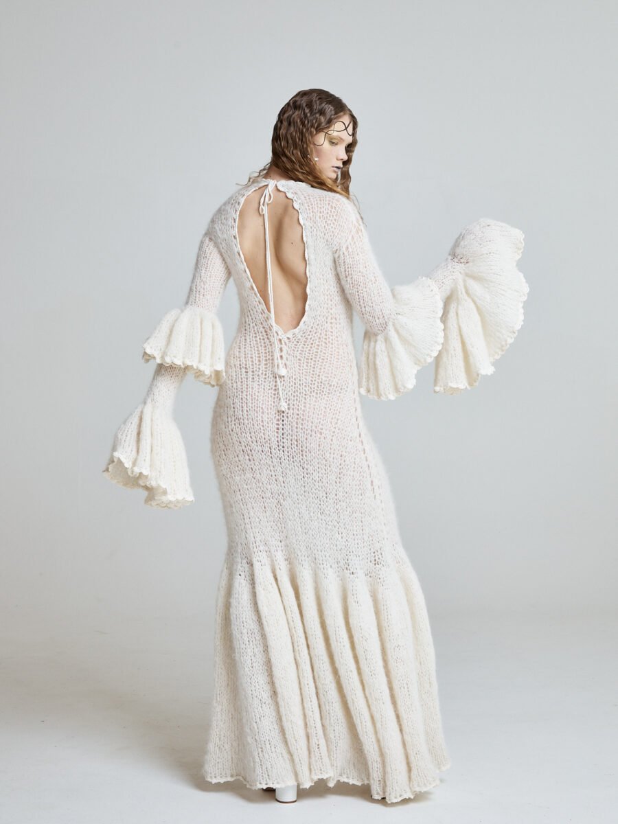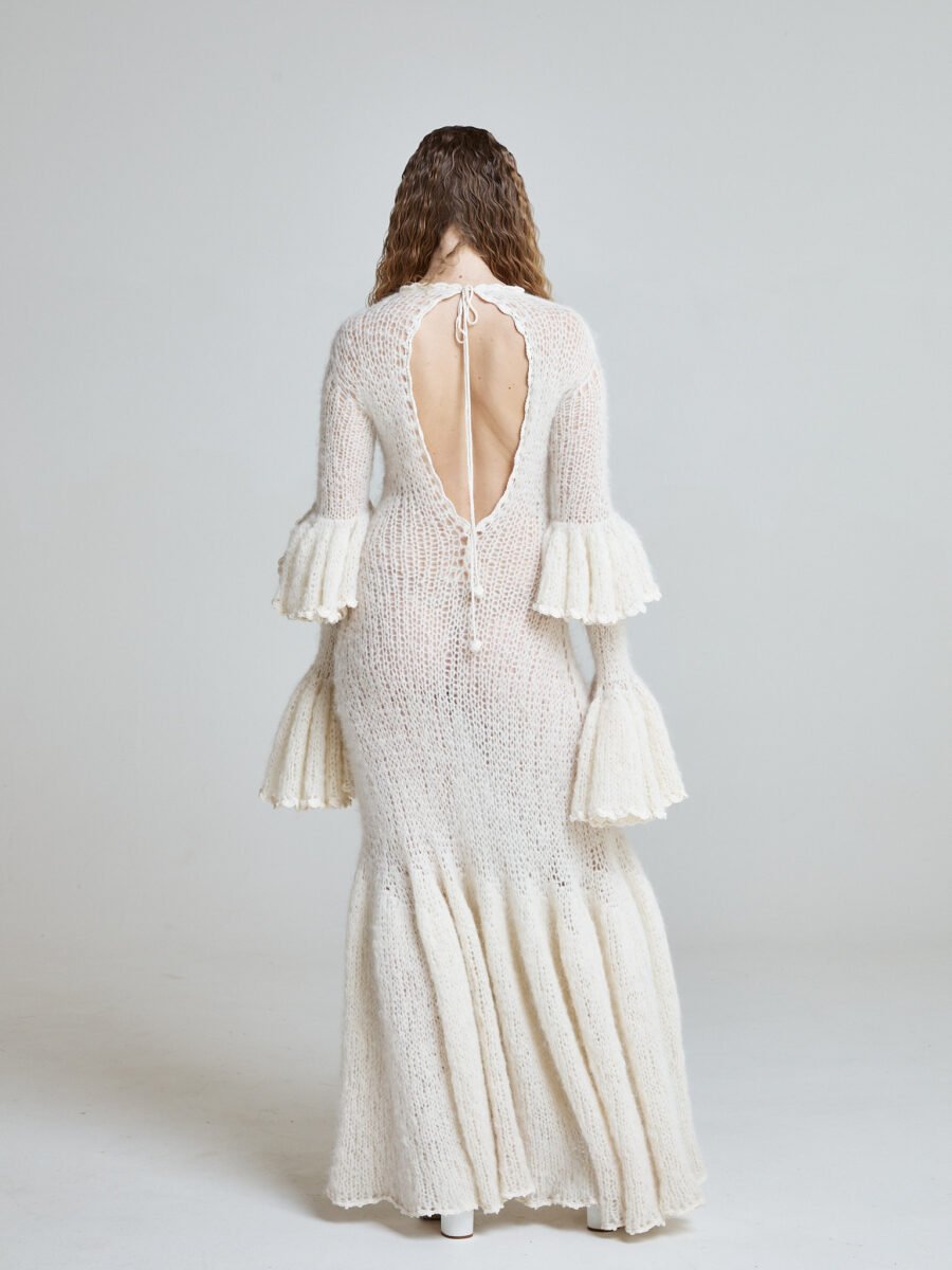 The open back, delicately tied at the neckline, balances the warmth of the knit with sensuality.