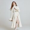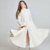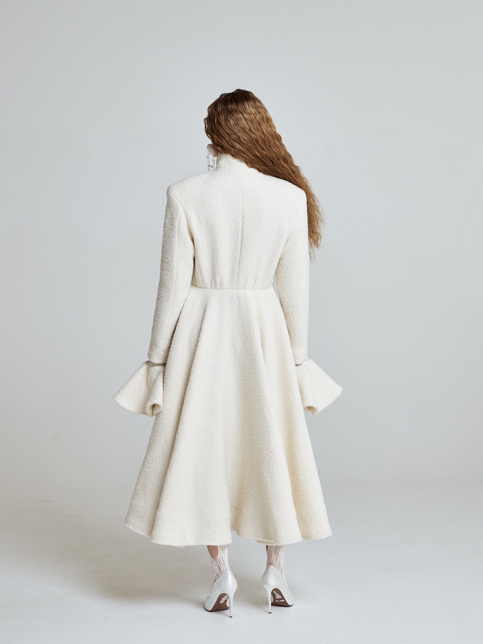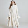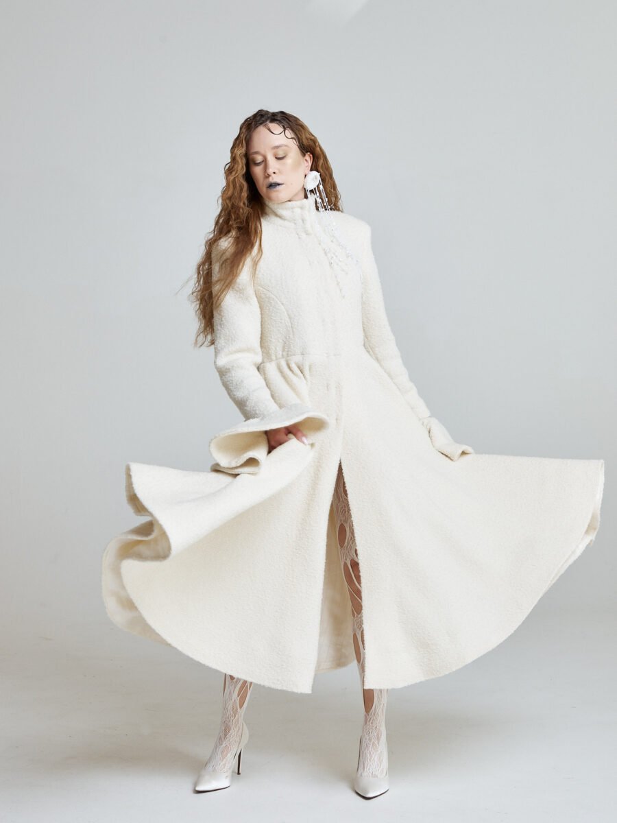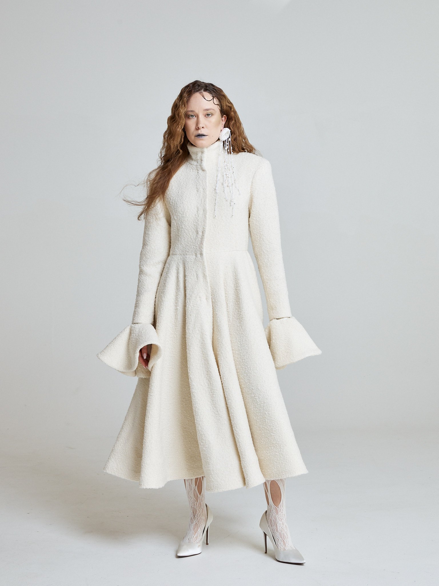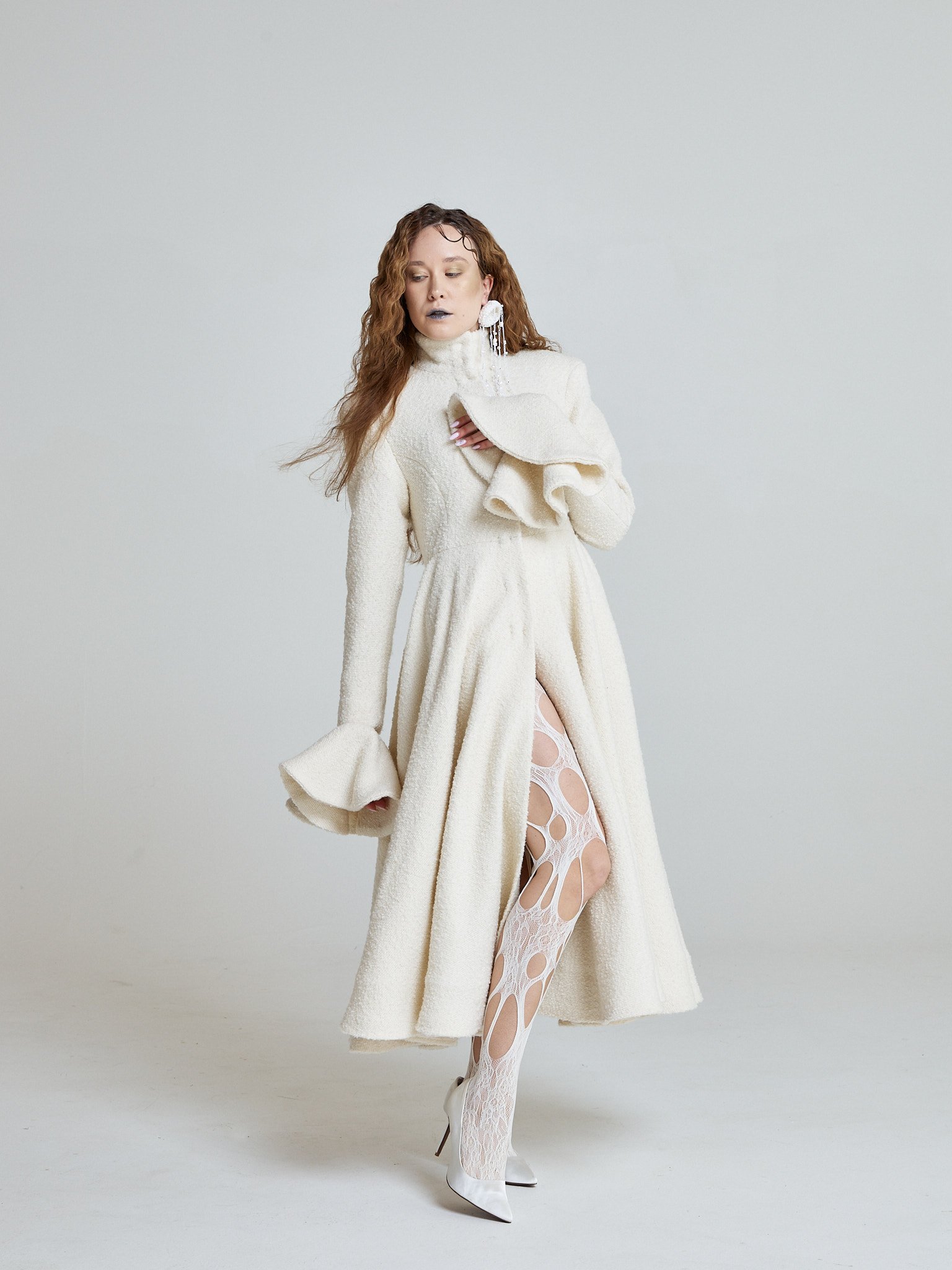 The Siren Sovereign Coat reinterprets the mermaid silhouette through structured tailoring. Crafted from 100% wool, the design sculpts the torso before releasing into a dramatic flared skirt – echoing the movement of a tail cutting through water.