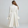 The elasticized waist subtly snatches and defines the figure while maintaining comfort and flexibility. The detachable cuff details add architectural volume to the sleeves, allowing transformation between a cleaner structured line and a more theatrical statement.