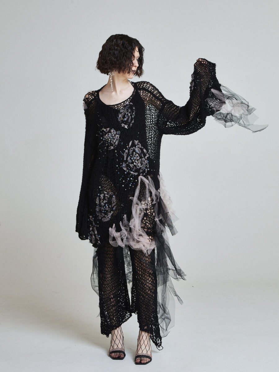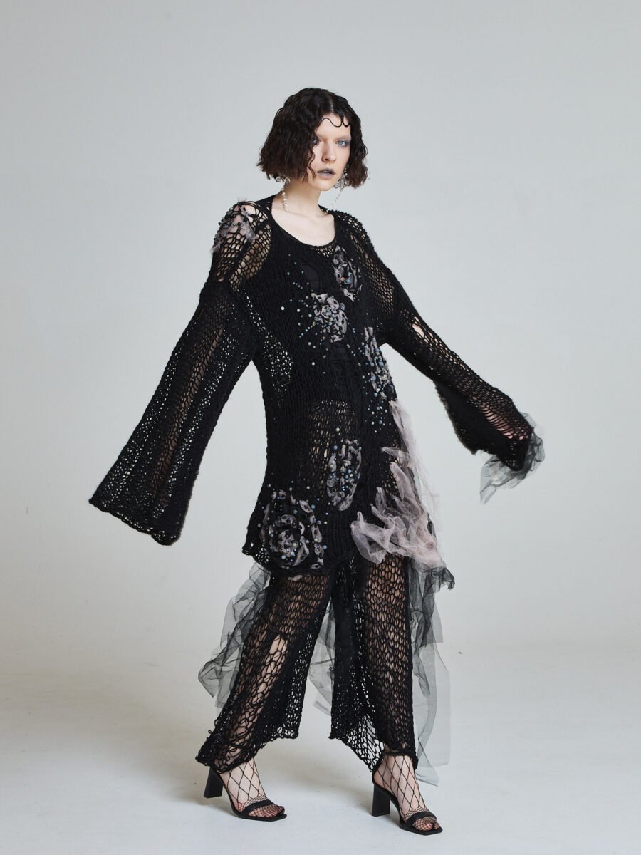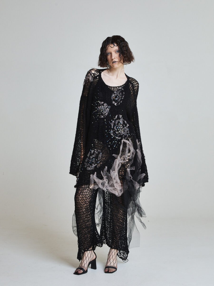Open crochet construction forms a net-like structure, while scattered semi-precious stones and crystal embellishments emerge like fragments of submerged artifacts. Soft tulle elements drift through the silhouette, creating movement against the structured knit.