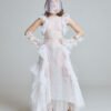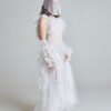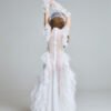 Where the black counterpart speaks of depth, this gown reflects surface light – the shimmer of waves under the sun. The layered organza holds its architectural shape, while soft tulle creates fluid motion around the body.