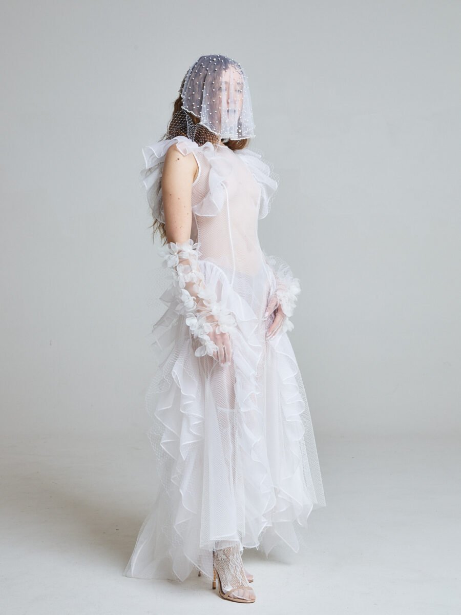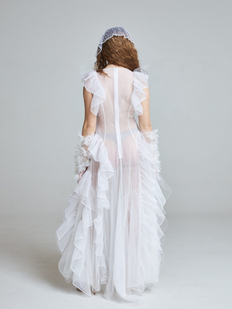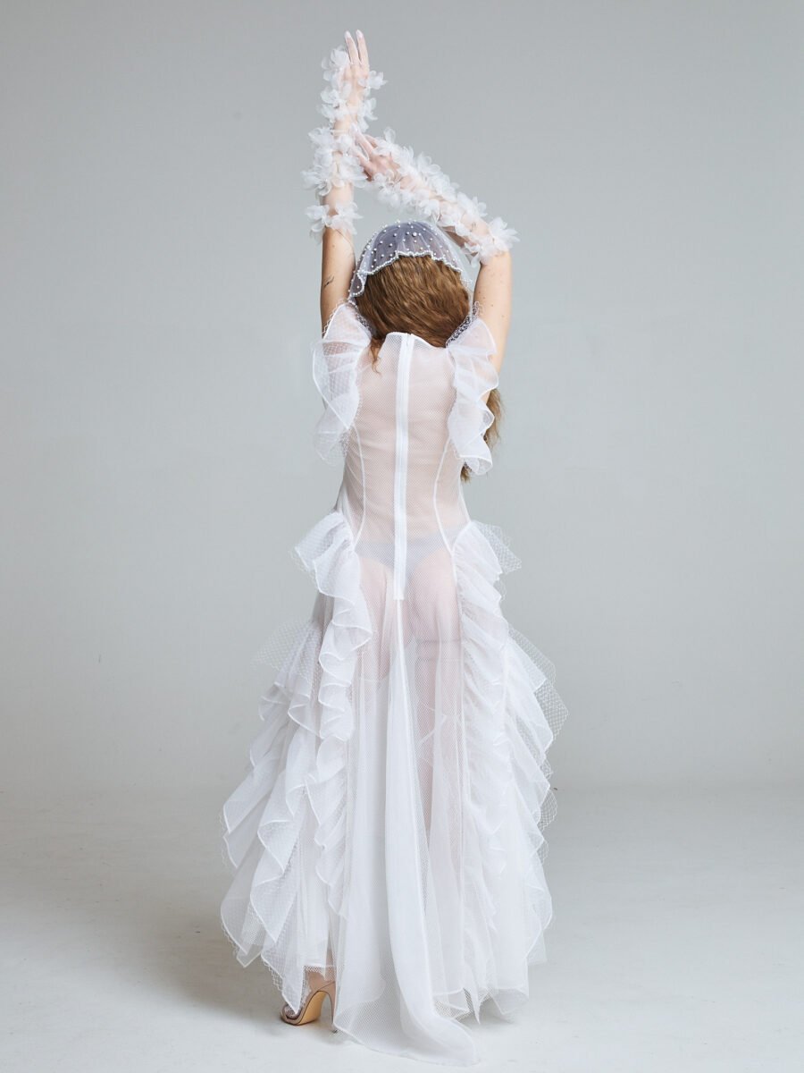 The Sunlit Tide Gown is crafted from 100% silk organza with layered white tulle, forming a transparent silhouette that shifts and ripples with movement. The sleeveless structure keeps the upper body clean and modern, while cascading ruffles sculpt the neckline, waist, and hem.