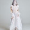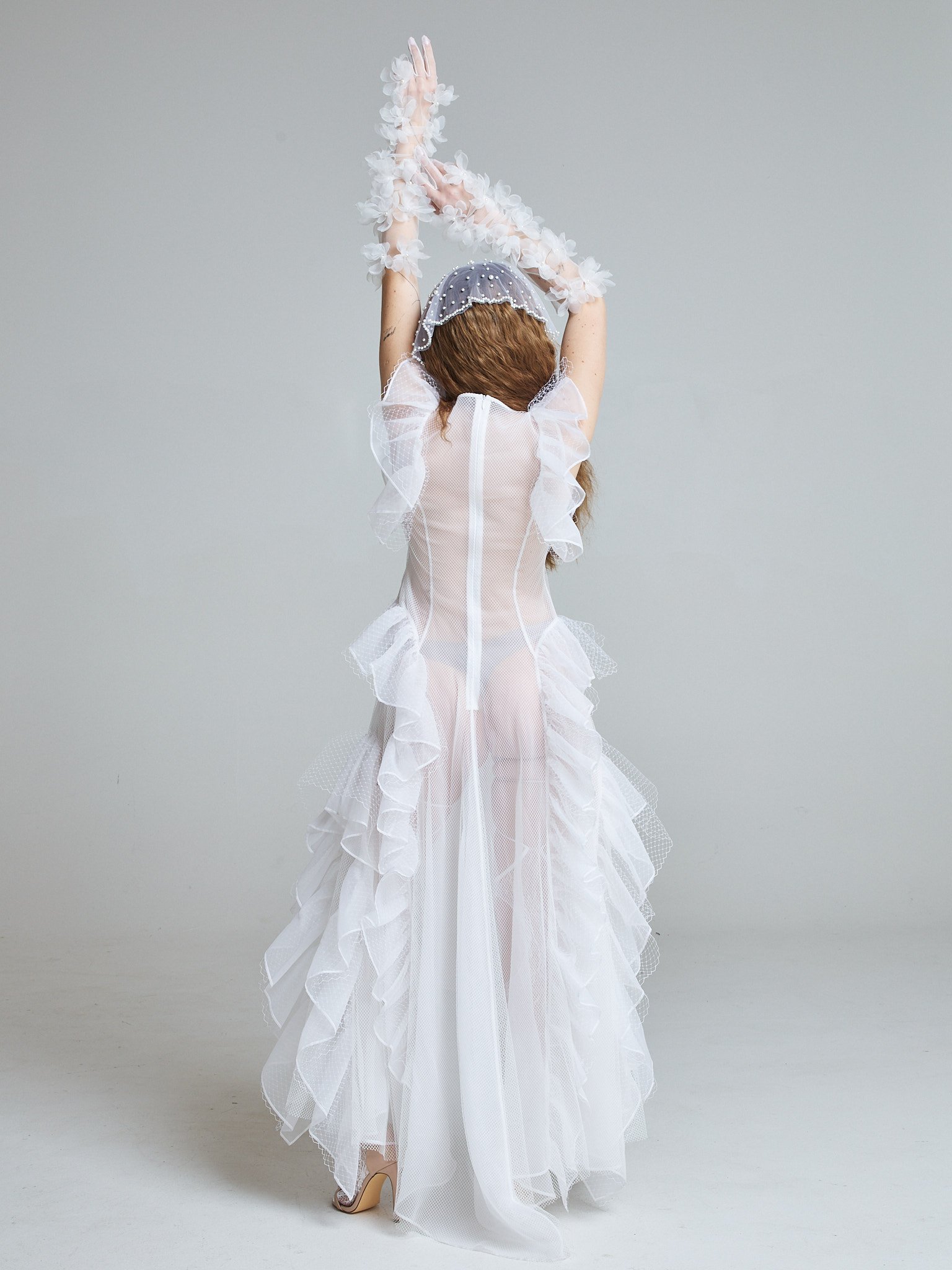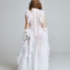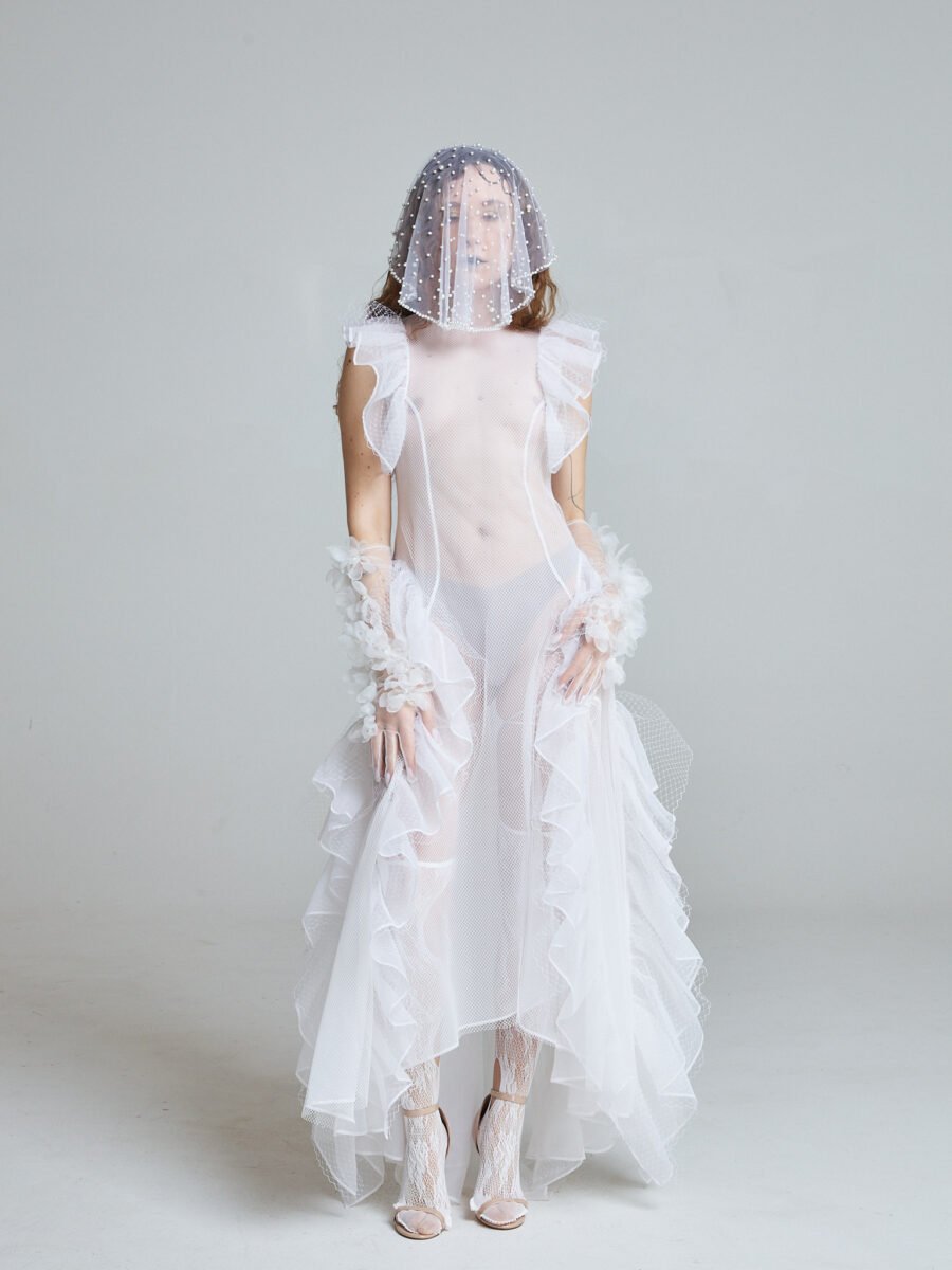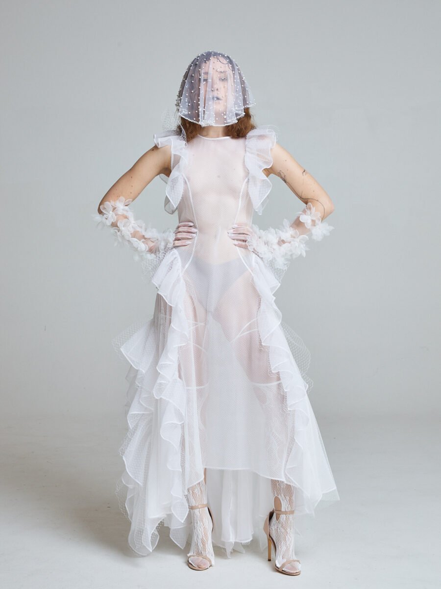The Sunlit Tide Gown is crafted from 100% silk organza with layered white tulle, forming a transparent silhouette that shifts and ripples with movement. The sleeveless structure keeps the upper body clean and modern, while cascading ruffles sculpt the neckline, waist, and hem.
