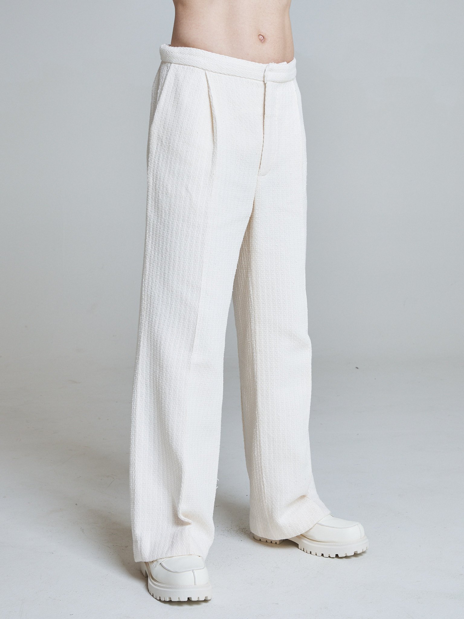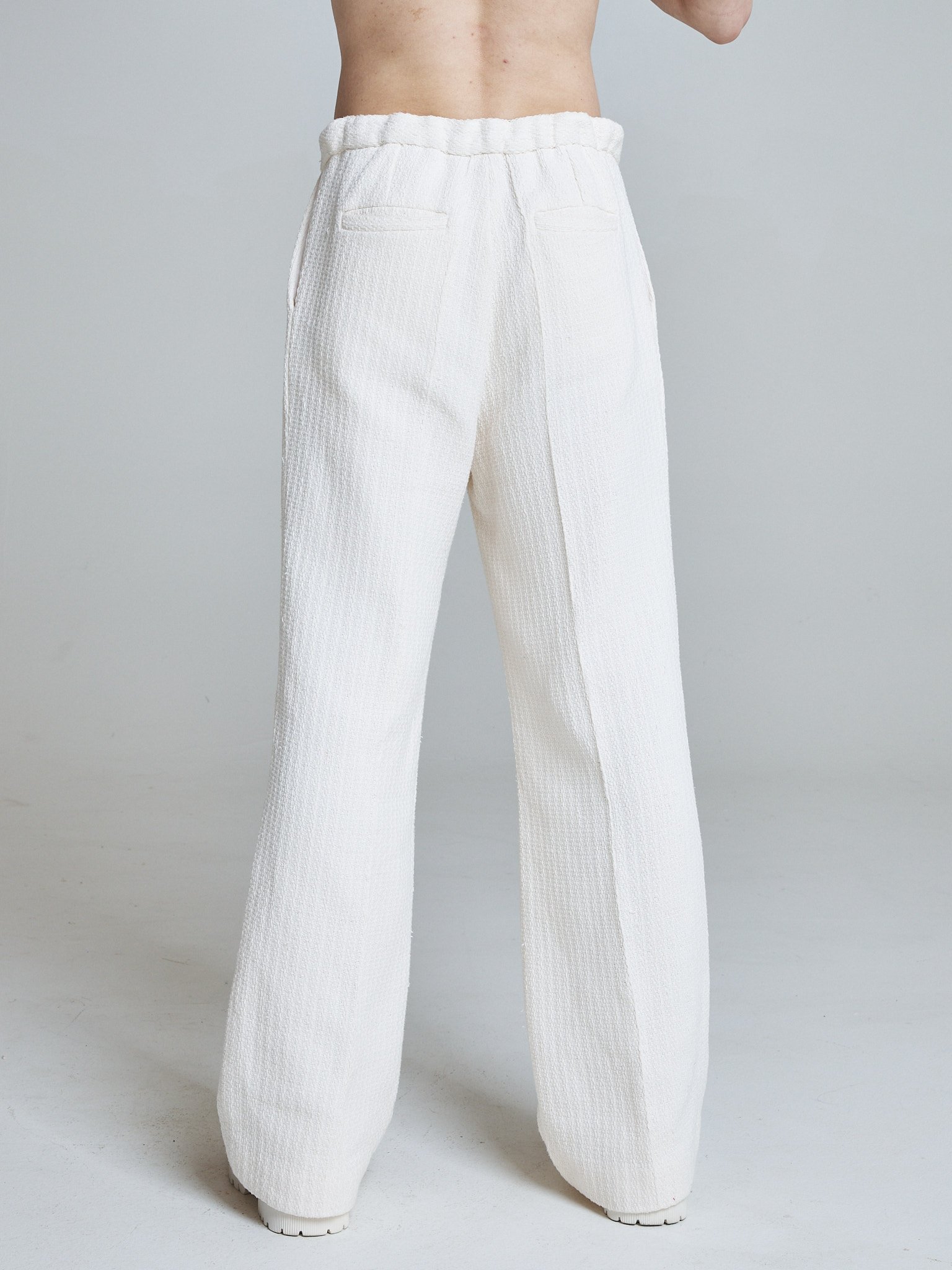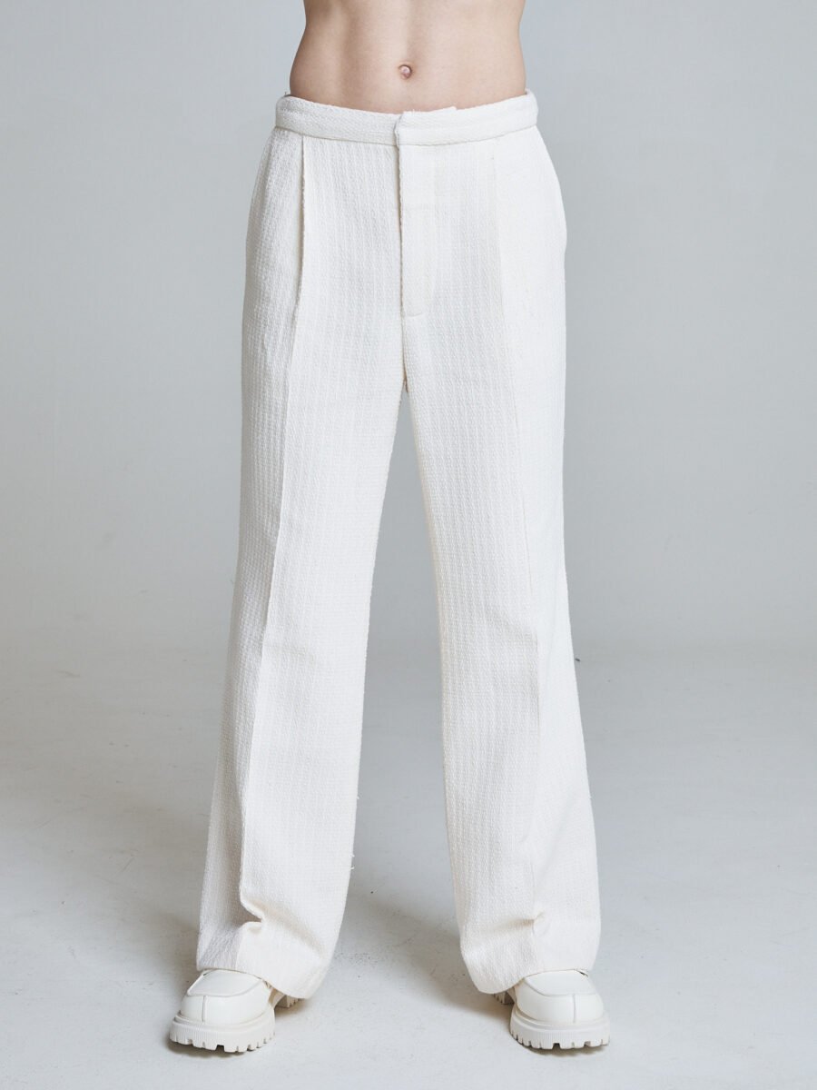 The fabric holds shape while remaining breathable and fluid. The cut elongates the leg and allows movement, making them a foundational piece within the collection.