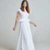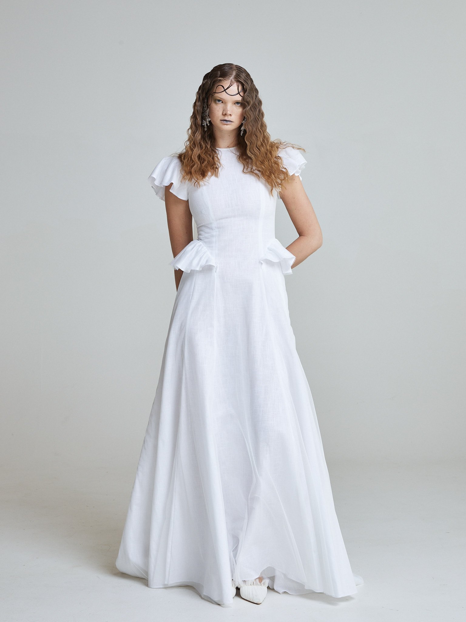 Delicate ruffle details frame the shoulders and hips – subtle waves that shape the body without excess structure. The result is balanced: grounded in linen, lifted by lightness.