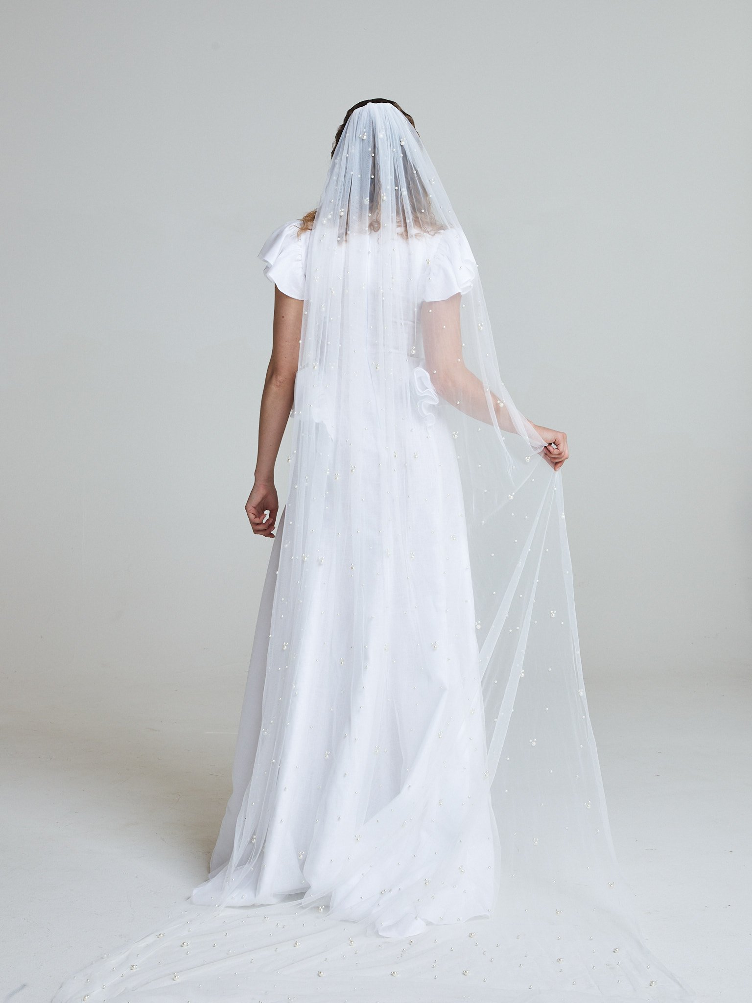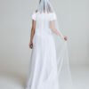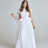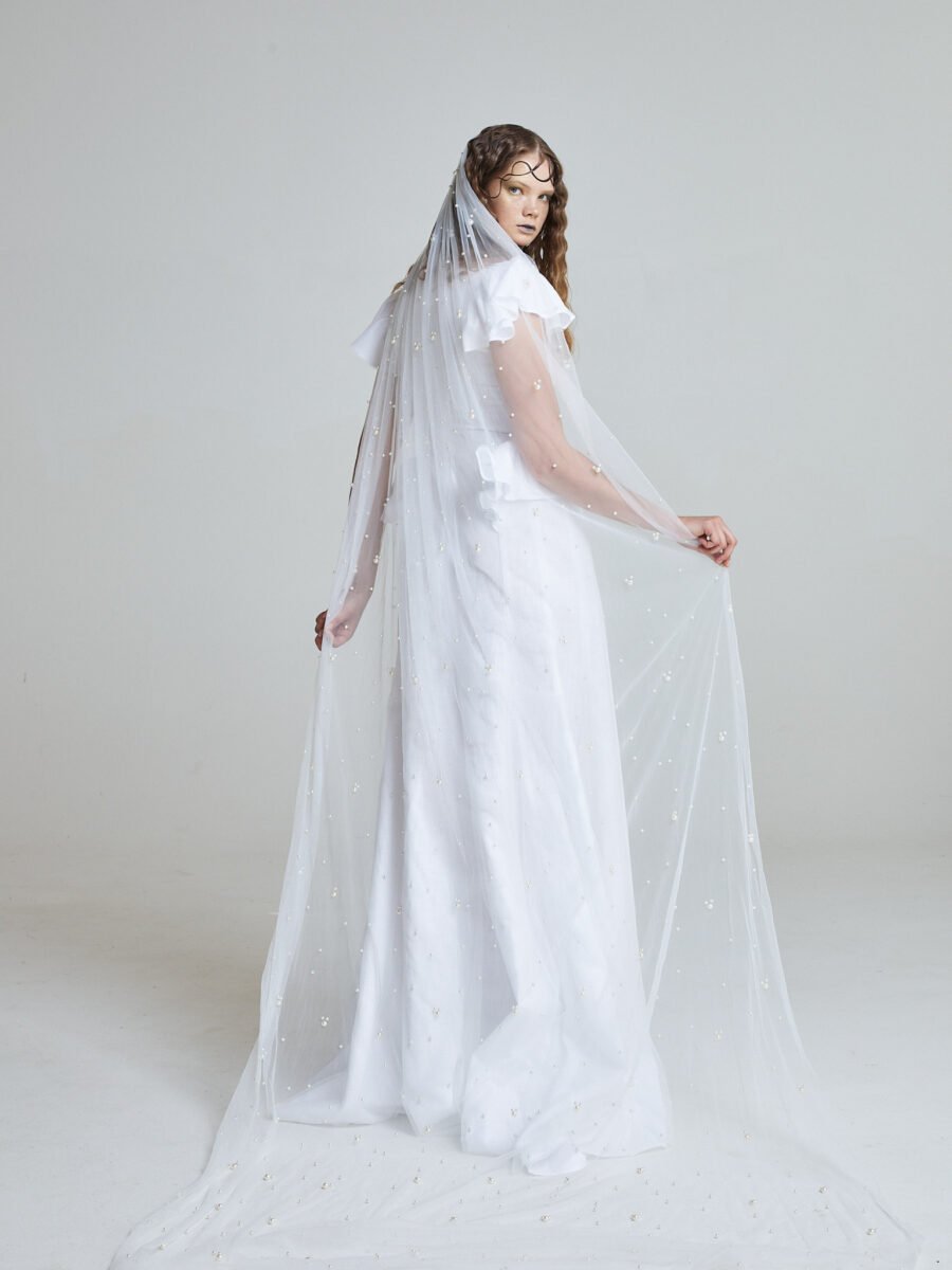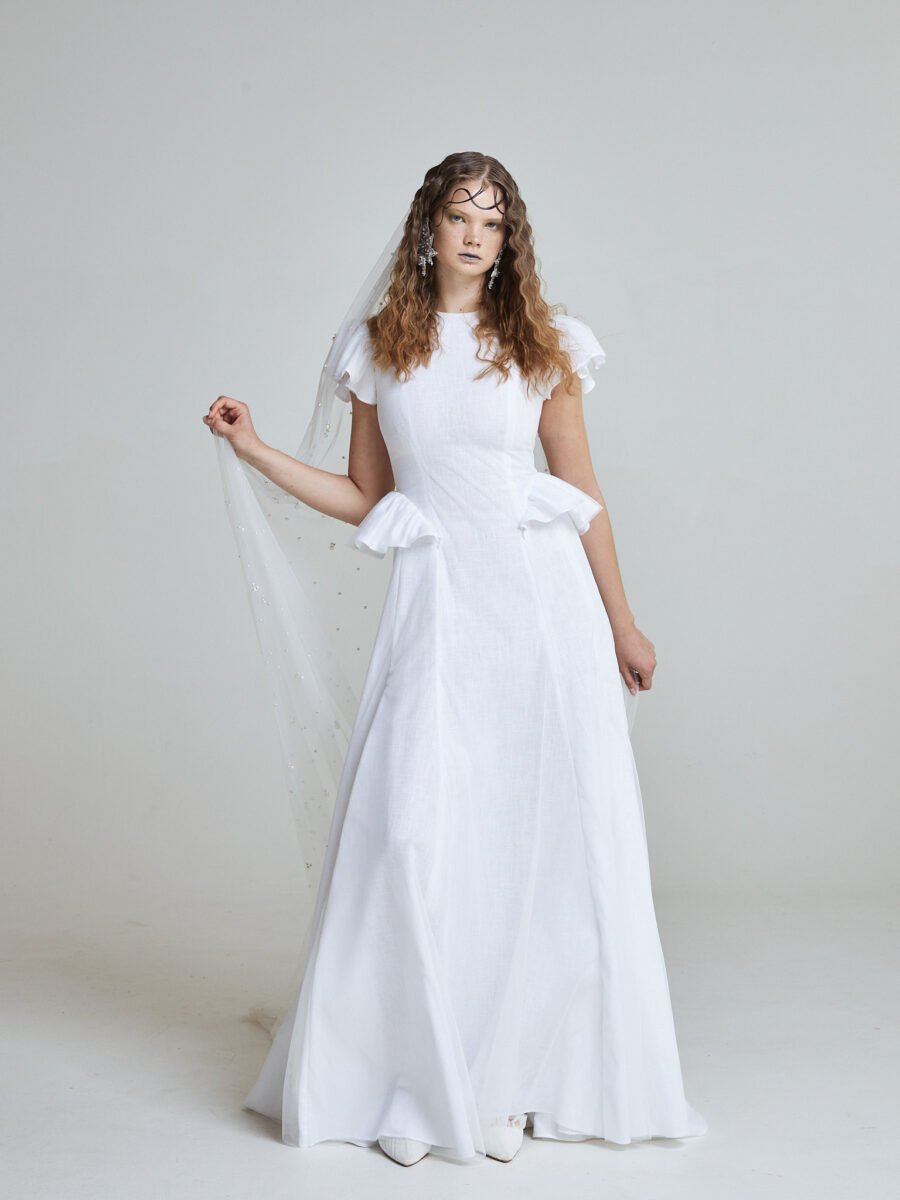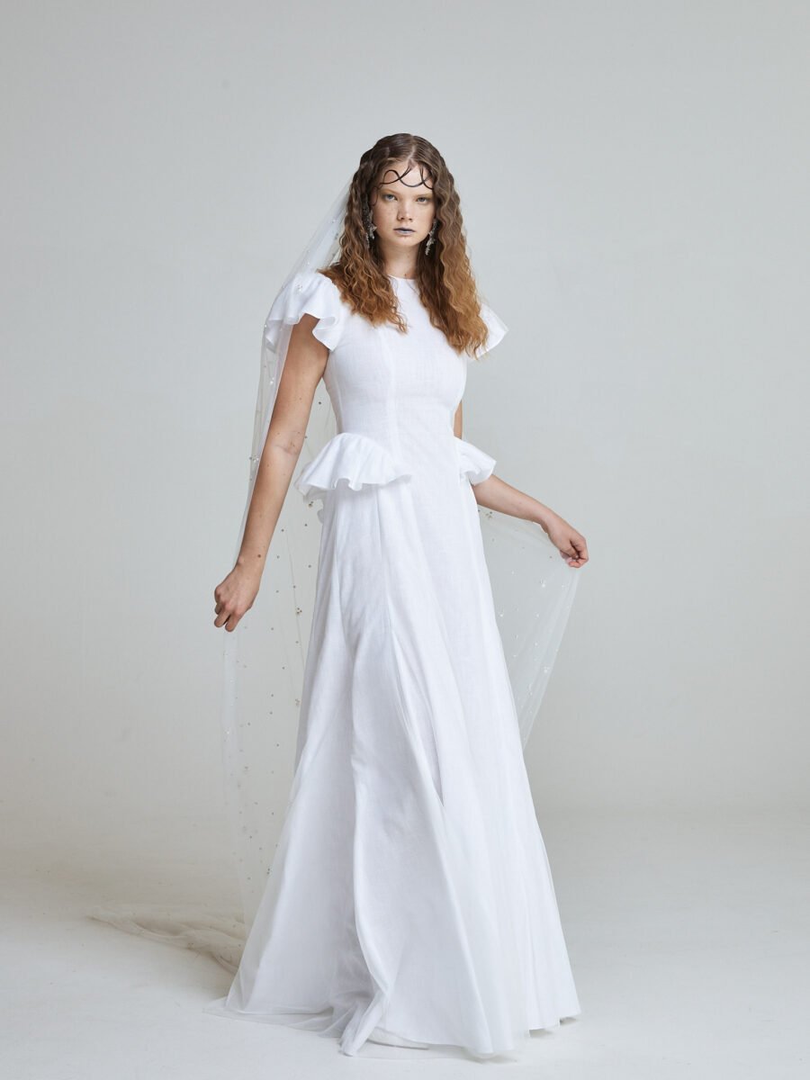 The Tide Bride Gown is crafted from natural linen, layered with airy tulle for gentle movement. The silhouette is clean and elongated, allowing the fabric to fall effortlessly from the waist.