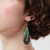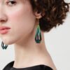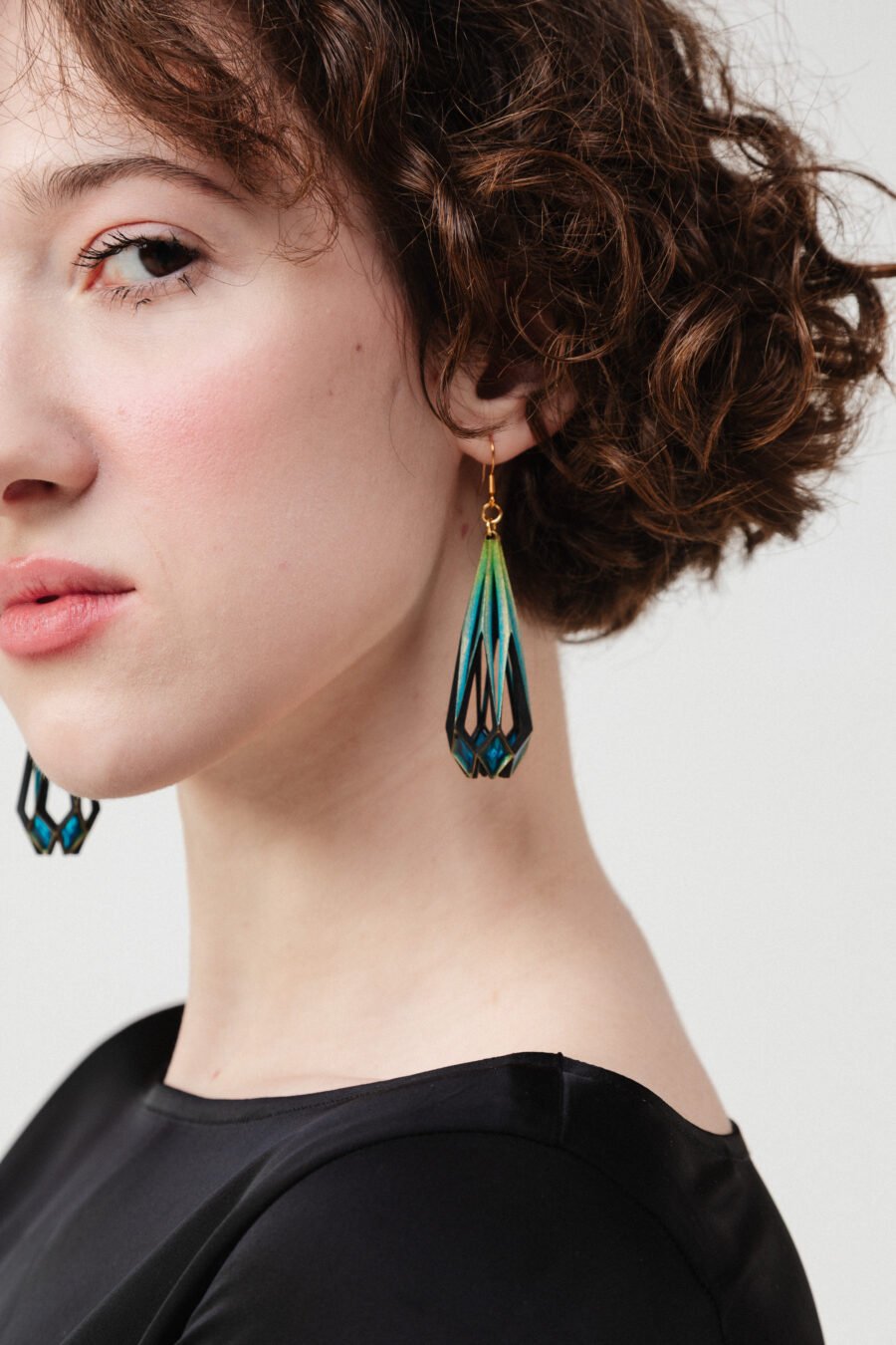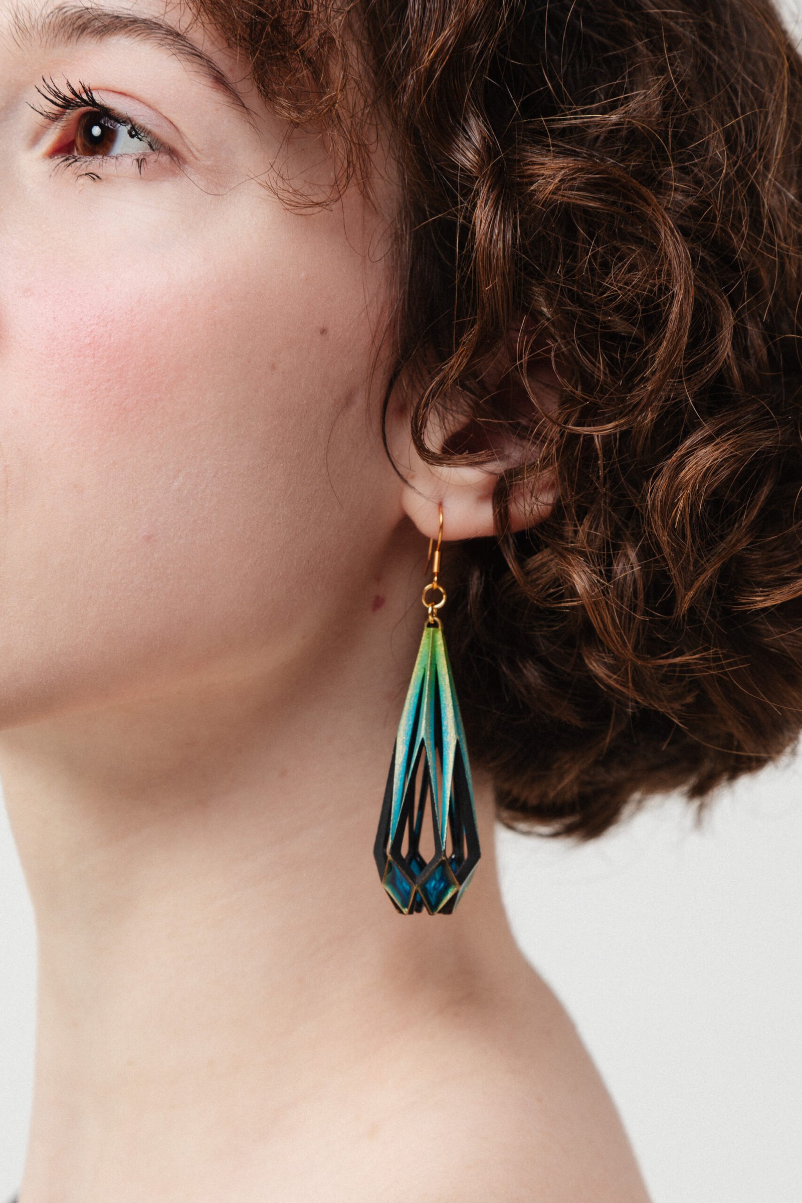 Layered with hand-applied gold detailing and finished in luminous UV resin, these earrings create a subtle glass-like glow that shifts from soft turquoise to deep midnight teal. The open filigree structure gives them dimension and airiness while maintaining architectural strength.