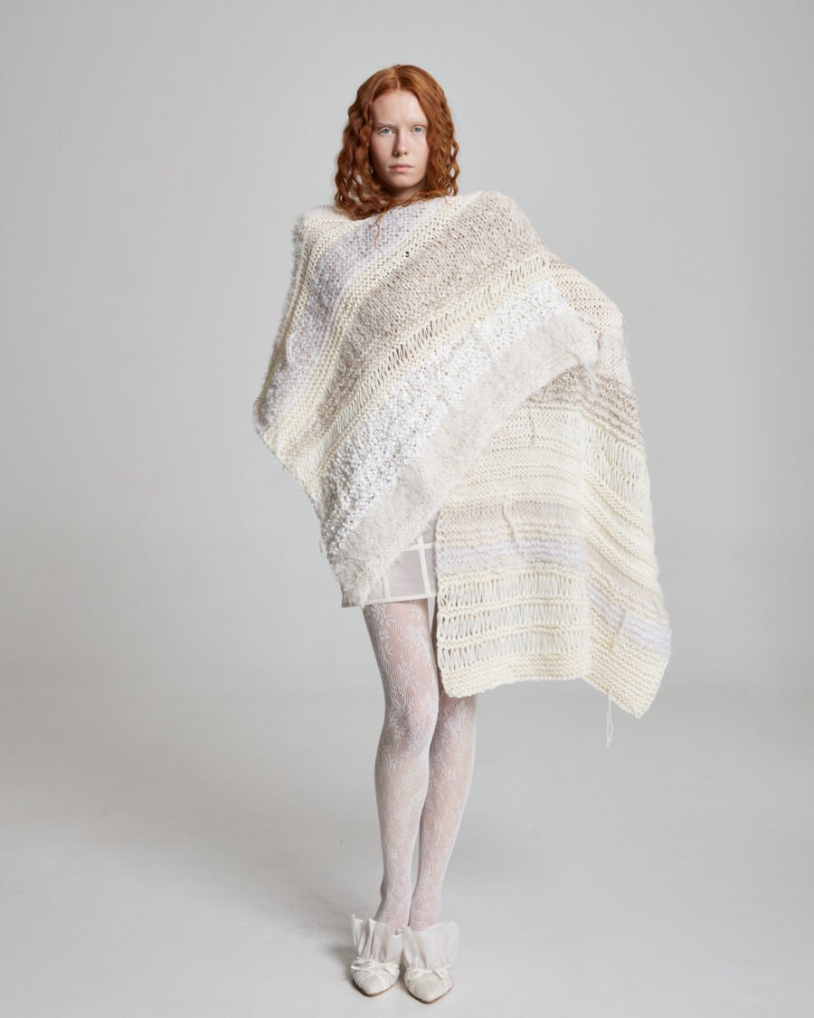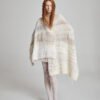 The scale is generous, allowing it to function as a scarf, wrap, blanket or sculptural layering piece. Its tactile quality is unmistakable – soft yet substantial, airy yet insulating.