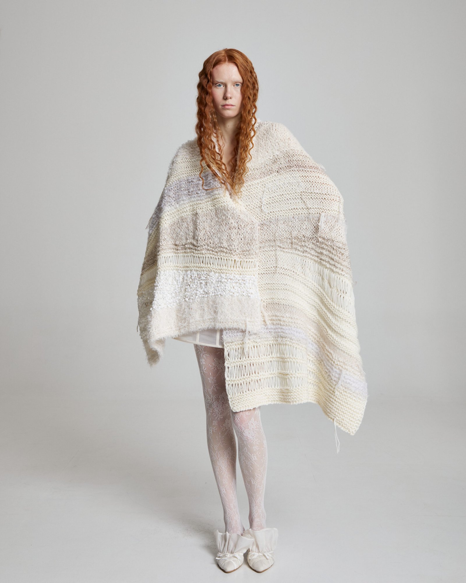 Hand knitted from a curated blend of five natural wool fibers, this oversized scarf celebrates texture and material diversity.